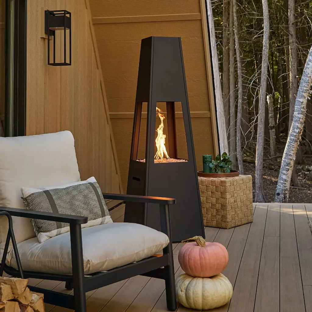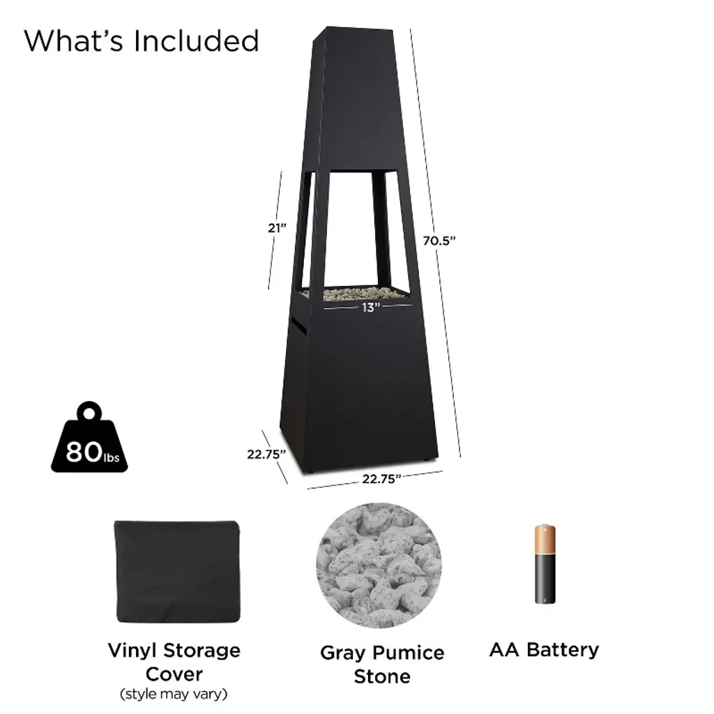 Add a unique, focal point to your outdoor living space with the Ferro chiminea fire pit. Featuring a custom, built-in heat deflector and standing at a height of 70” this chiminea is designed for optimal heat output. Providing 50,000 BTUs of heat and made of durable, heavy-gauge steel, this modern outdoor fire pit has a substantial base that is large enough to conceal a 20 lb propane tank. This means you can maintain a clean, sleek look without an exposed gas source or hose. Equipped with a reliable one-hand push and turn ignition and adjustable flame height. Includes chiminea with leveling feet, stainless steel burner, pumice stone filler, storage cover and propane hose with regulator. Real Flame® gas fire pits are CSA certified and weather, sun and rust resistant. At Real Flame Company, we are committed to providing beautifully designed, safe, high-quality indoor electric fireplaces, outdoor gas fire pits and fire tables, and outdoor furniture.