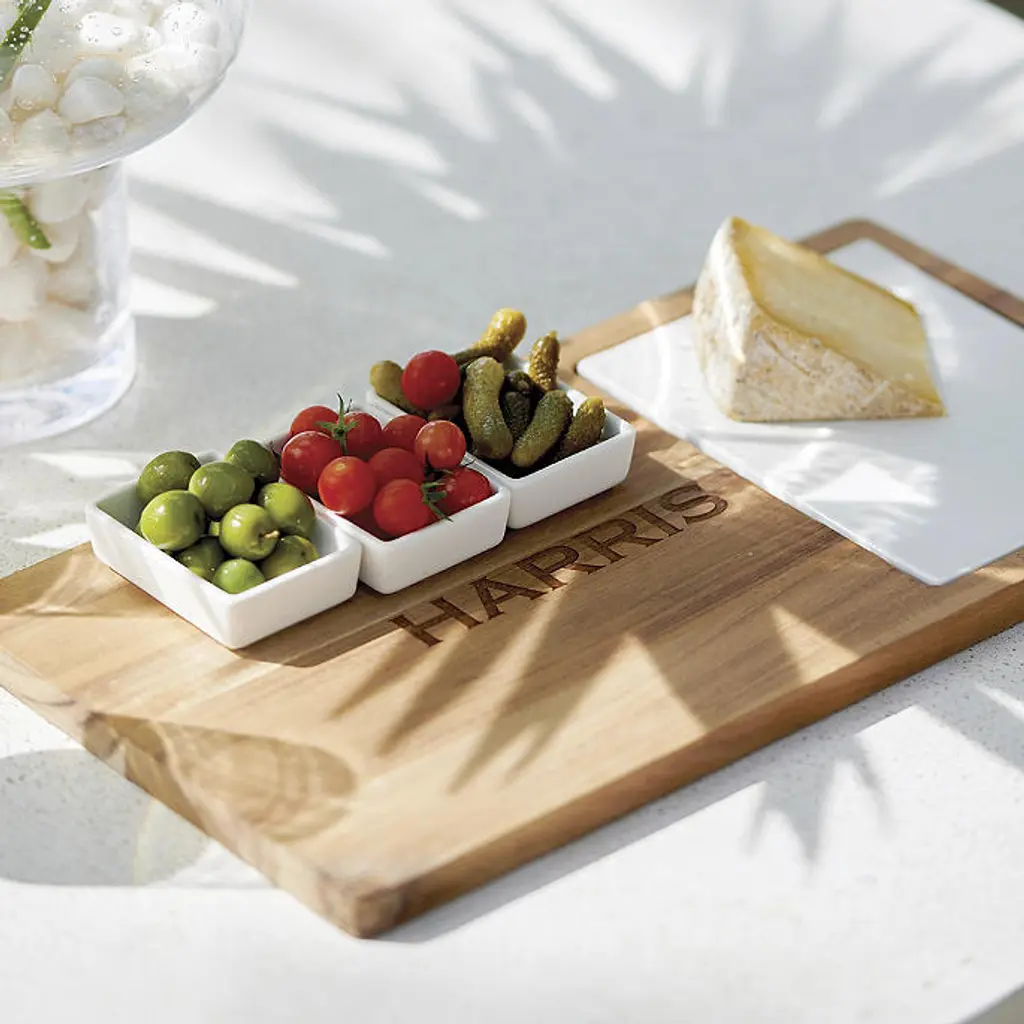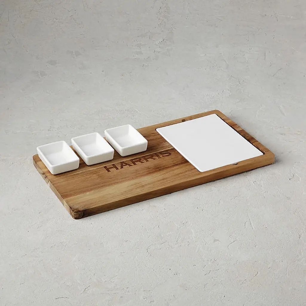 Add sophistication to any gathering with our beautiful and modern Fete Tray that can be personalized with your family name. Crafted of solid wood, each tray includes ceramic accessories for serving snacks or appetizers. Solid wood tray Includes three ceramic dishes for snacks and one flat ceramic tray that can be pre-chilled in the refrigerator Personalize with your choice of Copperplate or Mixed fonts Ceramic dishes are machine washable At Frontgate, our primary focus is quality. We guarantee that every product we sell will stand up to the supreme test – our customers' satisfaction. To learn more about our policies, visit our Shipping & Processing, Returns & Exchanges and Warranty & Price Guarantee pages.