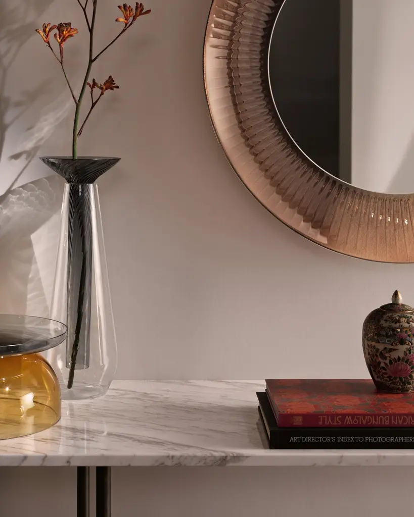 Free standing or wall mirror with 6mm glass frame fused at high temperature, and available in the transparent shades smoke or antique rose color or amber. 5 mm central mirror. Free standing version made of metallic Champagne finish metal structure with integrated led lighting system. (Only for free standing version). Solid wooden foot, tobacco oak finish.