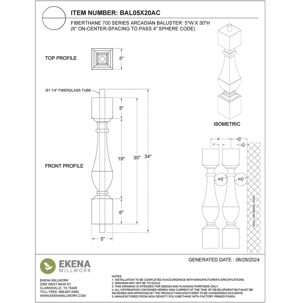 Fiberthane 700 Series Arcadian Baluster, Factory Primed - 5"w X 30"h