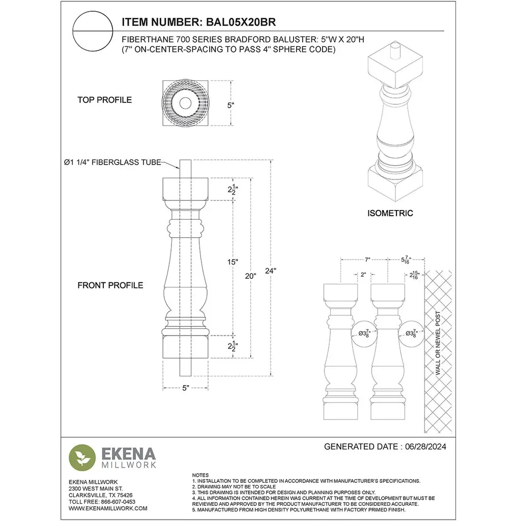 Fiberthane 700 Series Bradford Baluster, Factory Primed - 5"w X 20"h