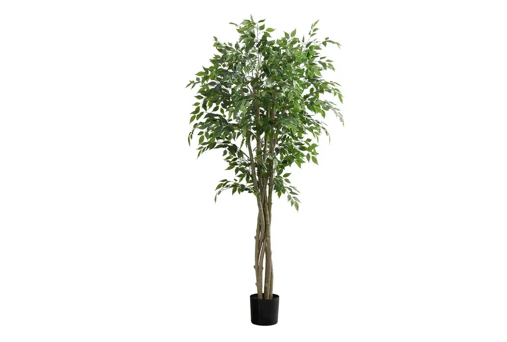 Stately and unique, the ficus tree is one of most interesting trees around, and will make the perfect complement to any home or office d_cor. The twisting trunks reach skyward, and suddenly burst into an explosion of green. With 378 leaves, this tree will fool even the smartest of birds, so watch for nests when you dust! Comes in a black pot with faux soil.