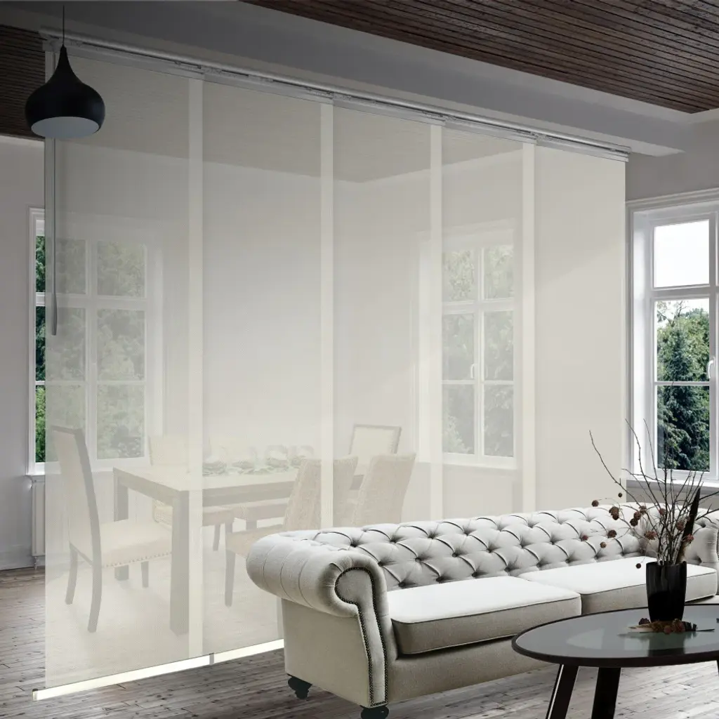 Central Design Products is pleased to introduce a new innovative panel track that offers easy 2-way installation, adding an alluring style and refined touch to your home decor. The single rail design of the track is sleek, compact, and reduces the overall footprint and weight of the installation, eliminating bulky, intrusive window treatments. Adjusting the panel height is a breeze � simply trim the panel, re-attach the liner, and install the panel weight. Detailed instructions are included.The panel track also features a patented slider design, made with aluminum and fitted with bearings that allow for durable and smooth operation. The sliders are stacked closer together than conventional panel tracks, reducing light bleed coming from the gaps between panels. This track has endless uses from dividing rooms, garages, offices, and closets to decorating windows and patios. Available in larger sizes including 8, 10, and 12 panels. Extends from 58-110� wide. Each panel measures 23.5" wide and 116" tall, with a total installation height of 118.5" (includes the 2.5" rail track). The track can be wall or ceiling mounted. The panels can stack on the left or the right. The clearance from the wall is extendable from 1.25� to 3.25� and projection from the wall is extendable from 3� to 4.25�. Fidel panel is made from 75% Vinyl 25% Polyester, with a light filtering shade that blocks 40% of the light.