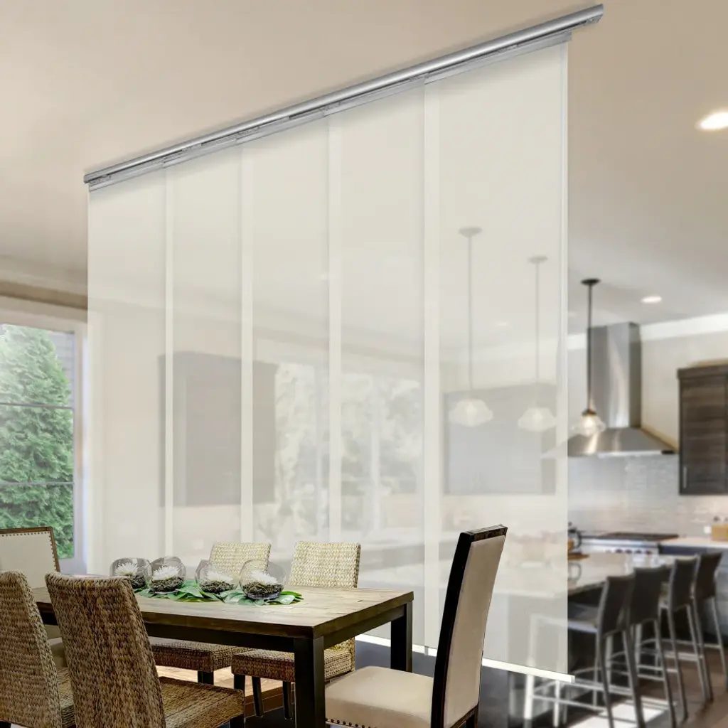 Central Design Products is pleased to introduce a new innovative panel track that offers easy 2-way installation, adding an alluring style and refined touch to your home decor. The single rail design of the track is sleek, compact, and reduces the overall footprint and weight of the installation, eliminating bulky, intrusive window treatments. Adjusting the panel height is a breeze � simply trim the panel, re-attach the liner, and install the panel weight. Detailed instructions are included.The panel track also features a patented slider design, made with aluminum and fitted with bearings that allow for durable and smooth operation. The sliders are stacked closer together than conventional panel tracks, reducing light bleed coming from the gaps between panels. This track has endless uses from dividing rooms, garages, offices, and closets to decorating windows and patios. Available in larger sizes including 8, 10, and 12 panels. Extends from 58-110� wide. Each panel measures 23.5" wide and 91.5" tall, with a total installation height of 94" (includes the 2.5" rail track). The track can be wall or ceiling mounted. The panels can stack on the left or the right. The clearance from the wall is extendable from 1.25� to 3.25� and projection from the wall is extendable from 3� to 4.25�. Fidel panel is made from 75% Vinyl 25% Polyester, with a light filtering shade that blocks 40% of the light.