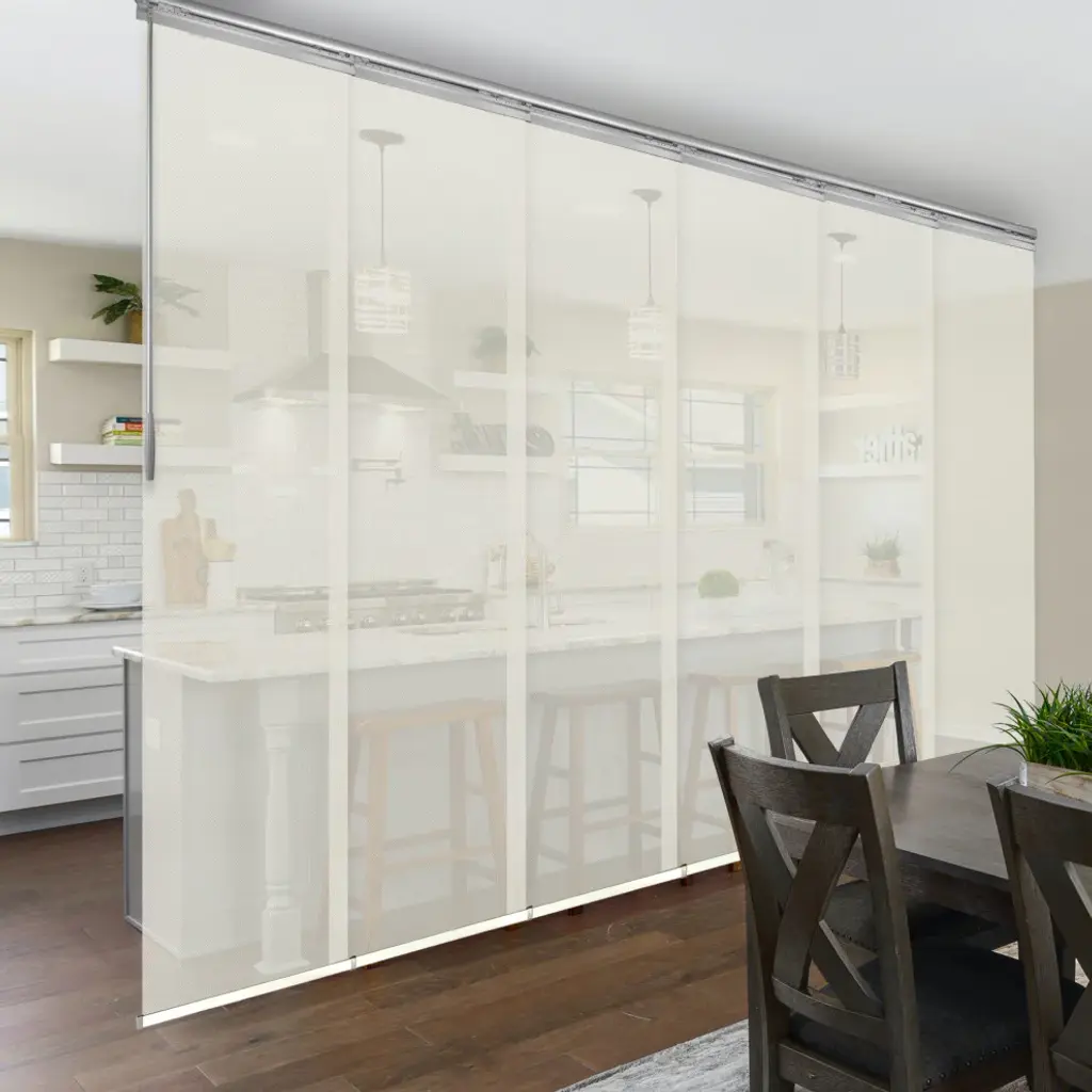 Central Design Products is pleased to introduce a new innovative panel track that offers easy 2-way installation, adding an alluring style and refined touch to your home decor. The single rail design of the track is sleek, compact, and reduces the overall footprint and weight of the installation, eliminating bulky, intrusive window treatments. Adjusting the panel height is a breeze � simply trim the panel, re-attach the liner, and install the panel weight. Detailed instructions are included.The panel track also features a patented slider design, made with aluminum and fitted with bearings that allow for durable and smooth operation. The sliders are stacked closer together than conventional panel tracks, reducing light bleed coming from the gaps between panels. This track has endless uses from dividing rooms, garages, offices, and closets to decorating windows and patios. Available in larger sizes including 8, 10, and 12 panels. Extends from 98-130� wide. Each panel measures 23.5" wide and 116" tall, with a total installation height of 118.5" (includes the 2.5" rail track). The track can be wall or ceiling mounted. The panels can stack on the left or the right. The clearance from the wall is extendable from 1.25� to 3.25� and projection from the wall is extendable from 3� to 4.25�. Fidel panel is made from 75% Vinyl 25% Polyester, with a light filtering shade that blocks 40% of the light.