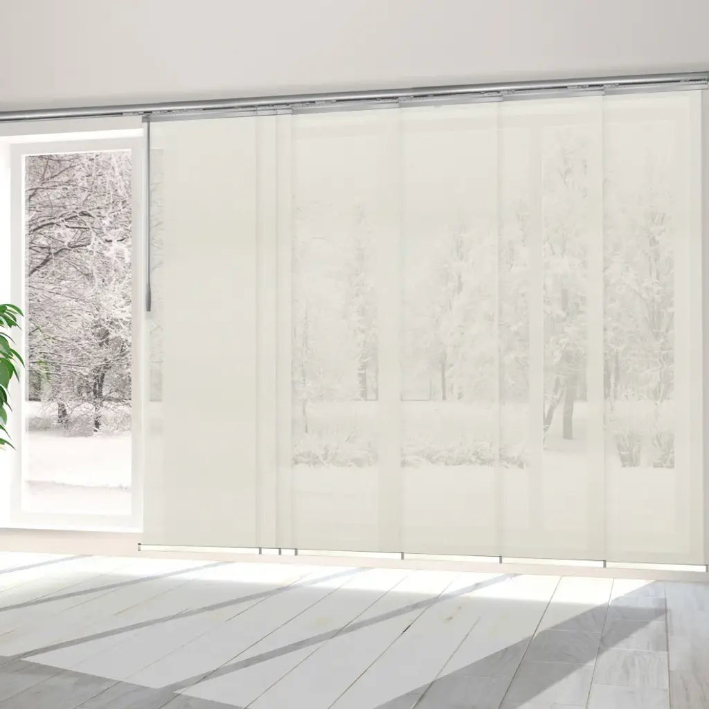 Central Design Products is pleased to introduce a new innovative panel track that offers easy 2-way installation, adding an alluring style and refined touch to your home decor. The single rail design of the track is sleek, compact, and reduces the overall footprint and weight of the installation, eliminating bulky, intrusive window treatments. Adjusting the panel height is a breeze � simply trim the panel, re-attach the liner, and install the panel weight. Detailed instructions are included.The panel track also features a patented slider design, made with aluminum and fitted with bearings that allow for durable and smooth operation. The sliders are stacked closer together than conventional panel tracks, reducing light bleed coming from the gaps between panels. This track has endless uses from dividing rooms, garages, offices, and closets to decorating windows and patios. Available in larger sizes including 8, 10, and 12 panels. Extends from 110-153� wide. Each panel measures 23.5" wide and 91.5" tall, with a total installation height of 94" (includes the 2.5" rail track). The track can be wall or ceiling mounted. The panels can stack on the left or the right. The clearance from the wall is extendable from 1.25� to 3.25� and projection from the wall is extendable from 3� to 4.25�. Fidel panel is made from 75% Vinyl 25% Polyester, with a light filtering shade that blocks 40% of the light.