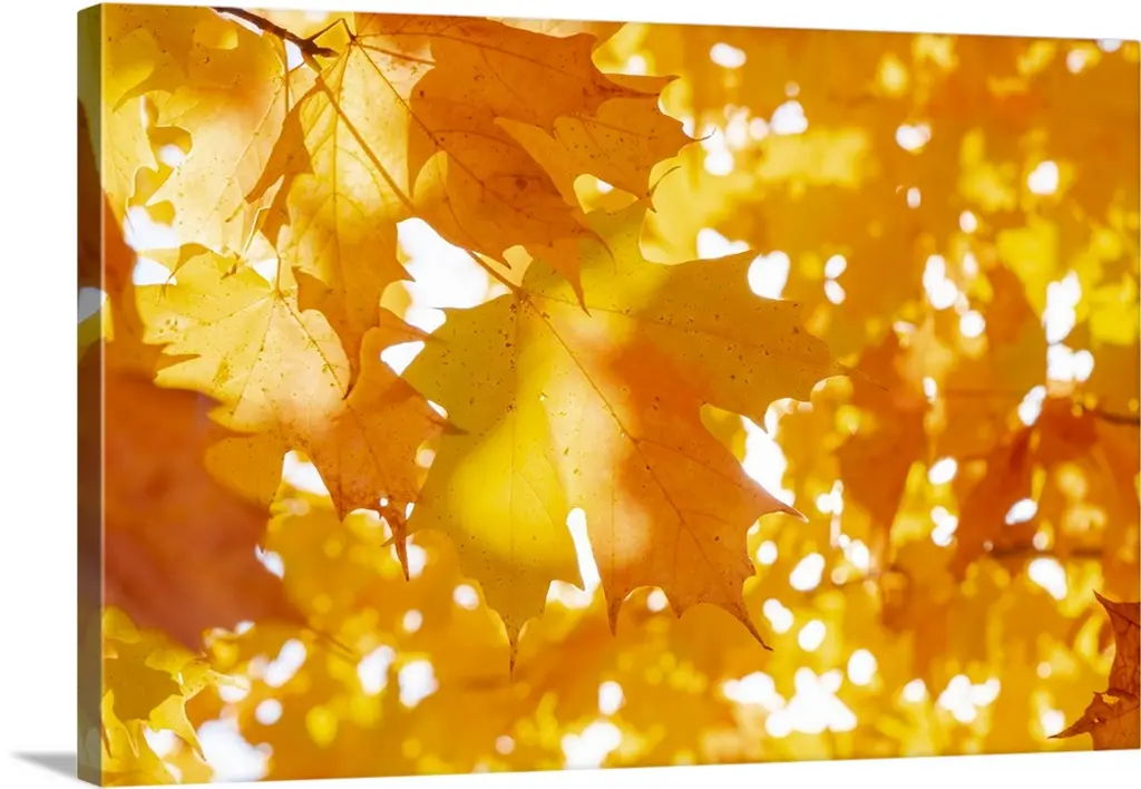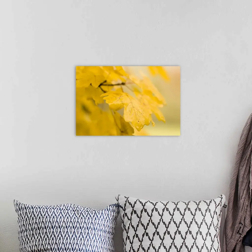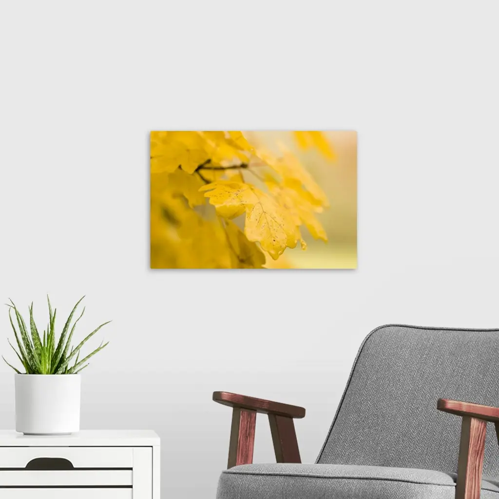 Field Maple leaves displaying their autumn colour in a woodland in the southwest of England.