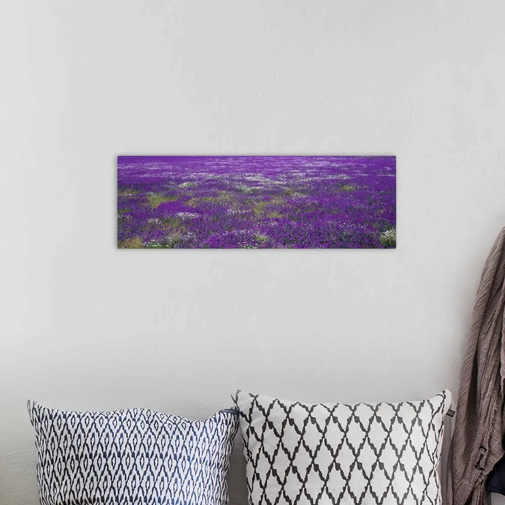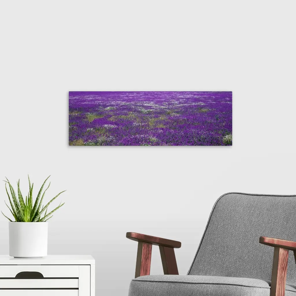Panoramic photograph on a big wall hanging of a vast field of purple wildflowers in Planicies, Portugal.