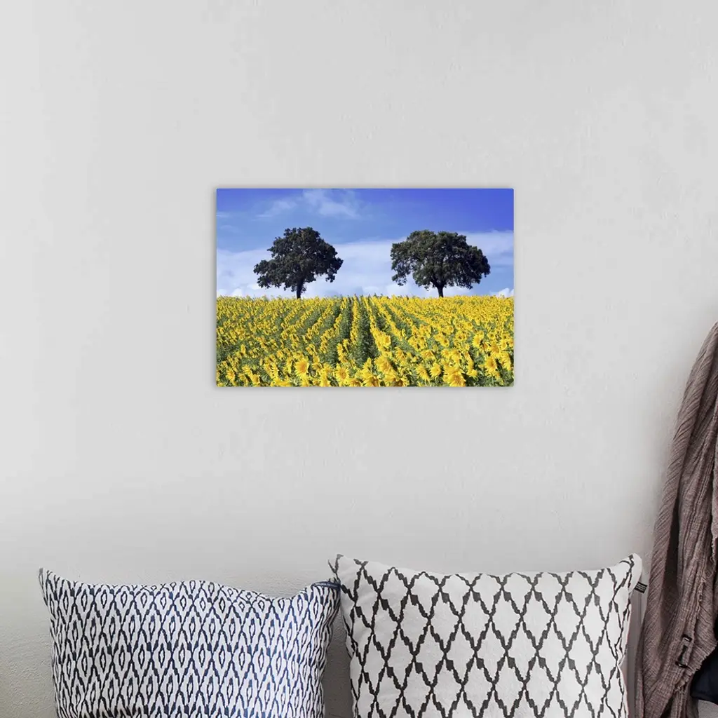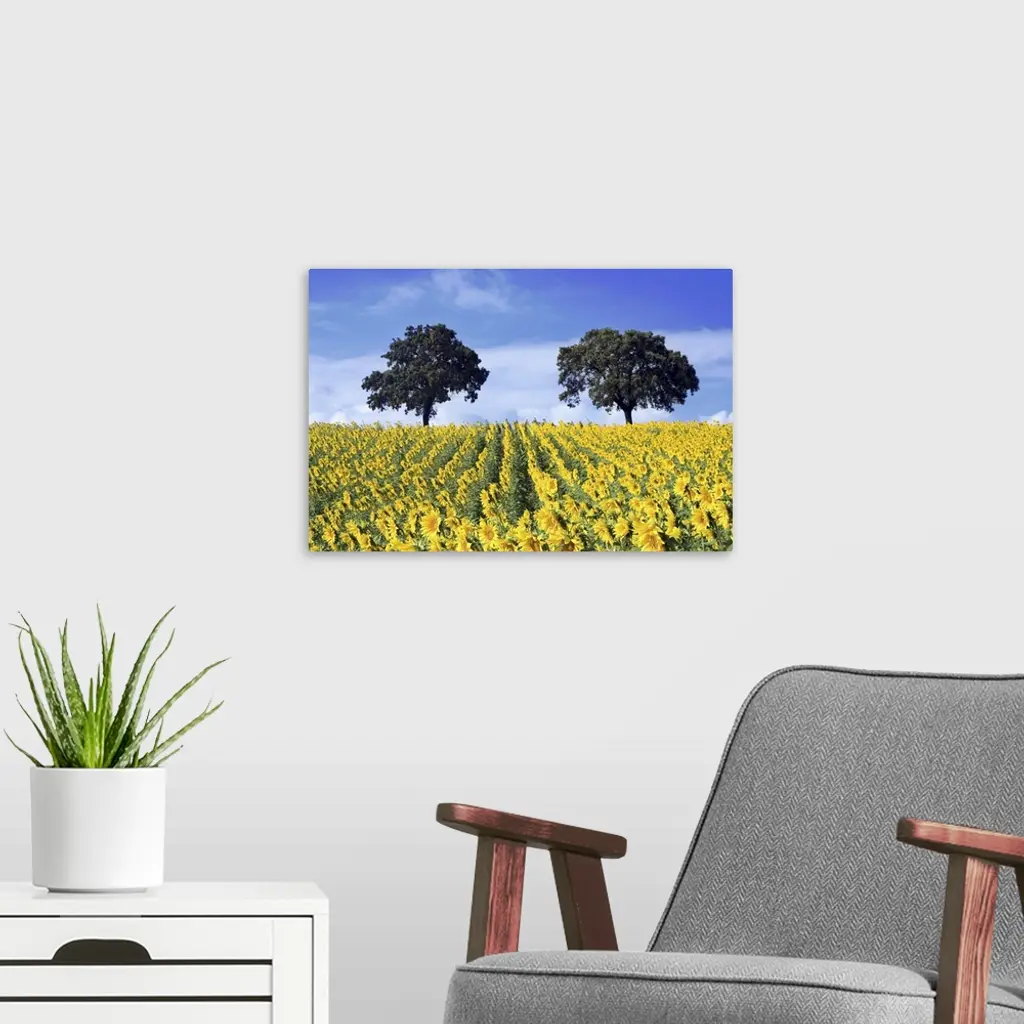 Andalusian landscape with cultivated sunflowers and remaining holm oaks from a former Mediterranean forest.