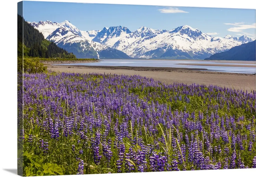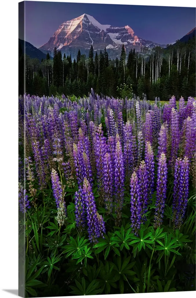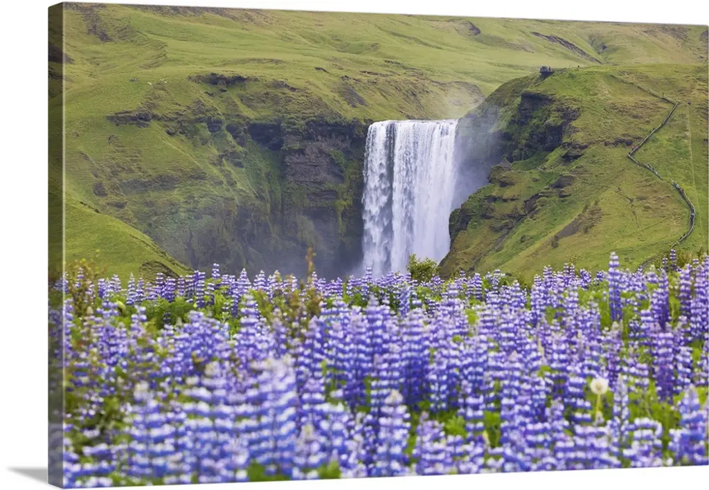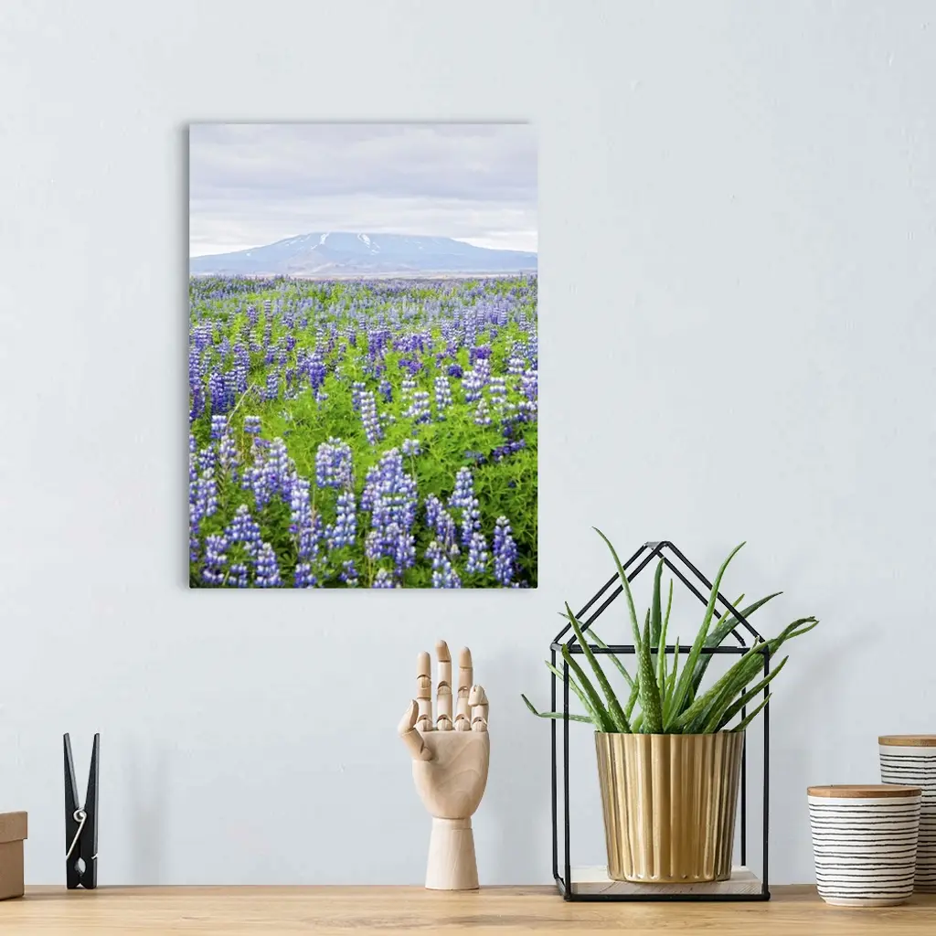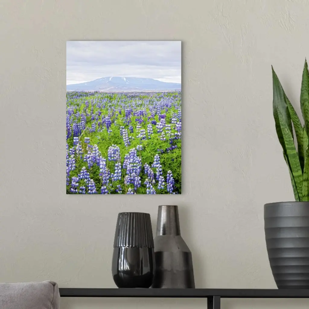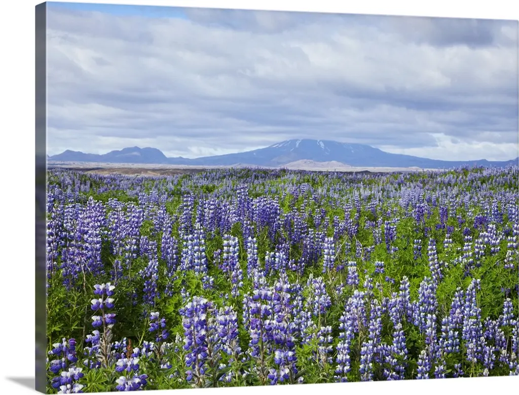 Field with lupine flowers, with a volcano in the background, Iceland.