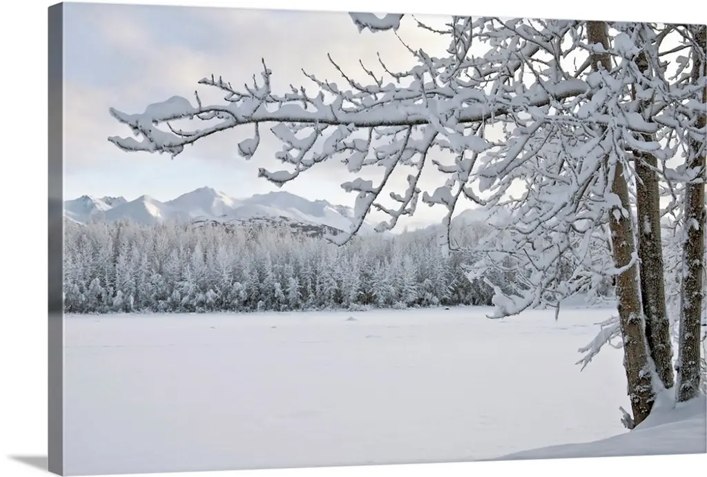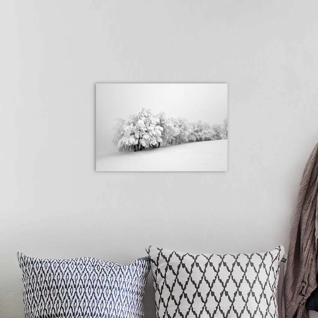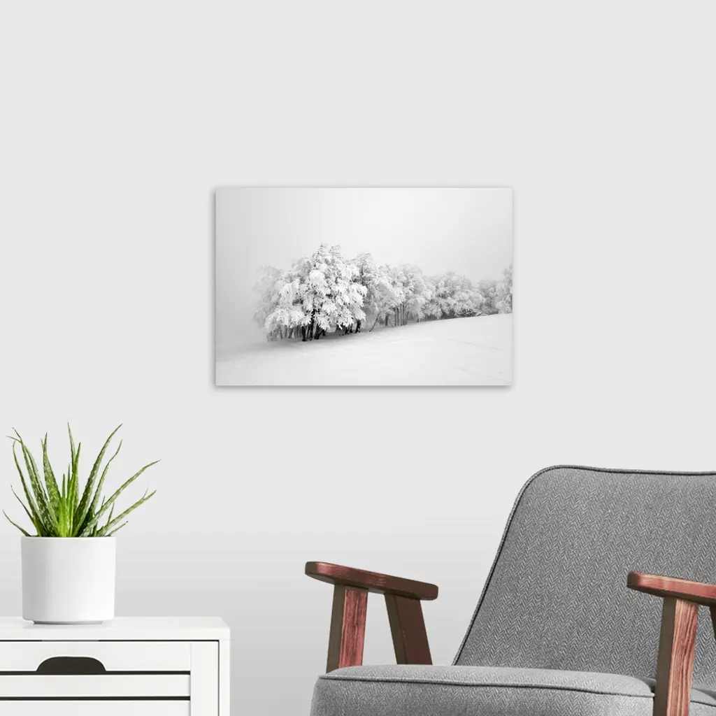 Snowy trees in the middle of the fog