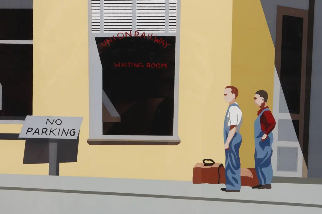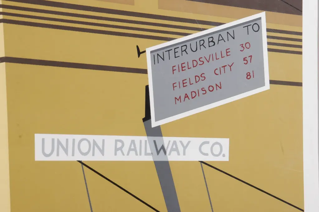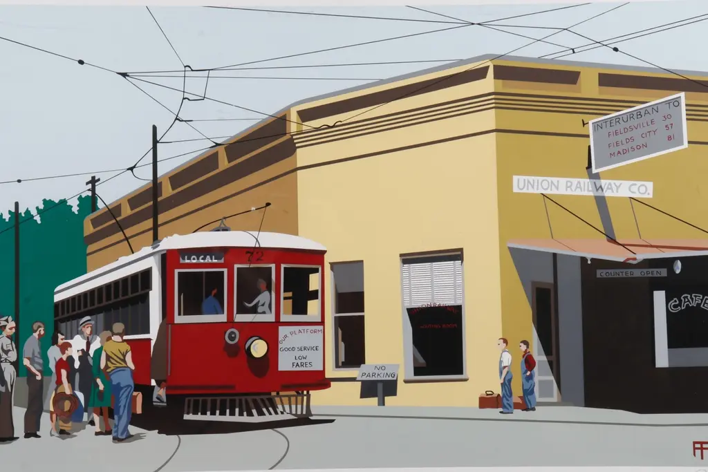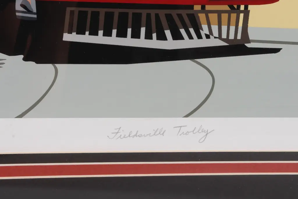 A hand stenciled limited-edition serigraph titled “Fieldsville Trolley” by Armond Fields (b.1930-2008). The scene depicts passengers boarding a red trolley car, with a cafe to the right and workers beneath a street sign that reads "Union Railway Co". Numbered 67/90 to the left, titled “Fieldsville Trolley” in the center, and signed to the right by the artist, all in pencil.