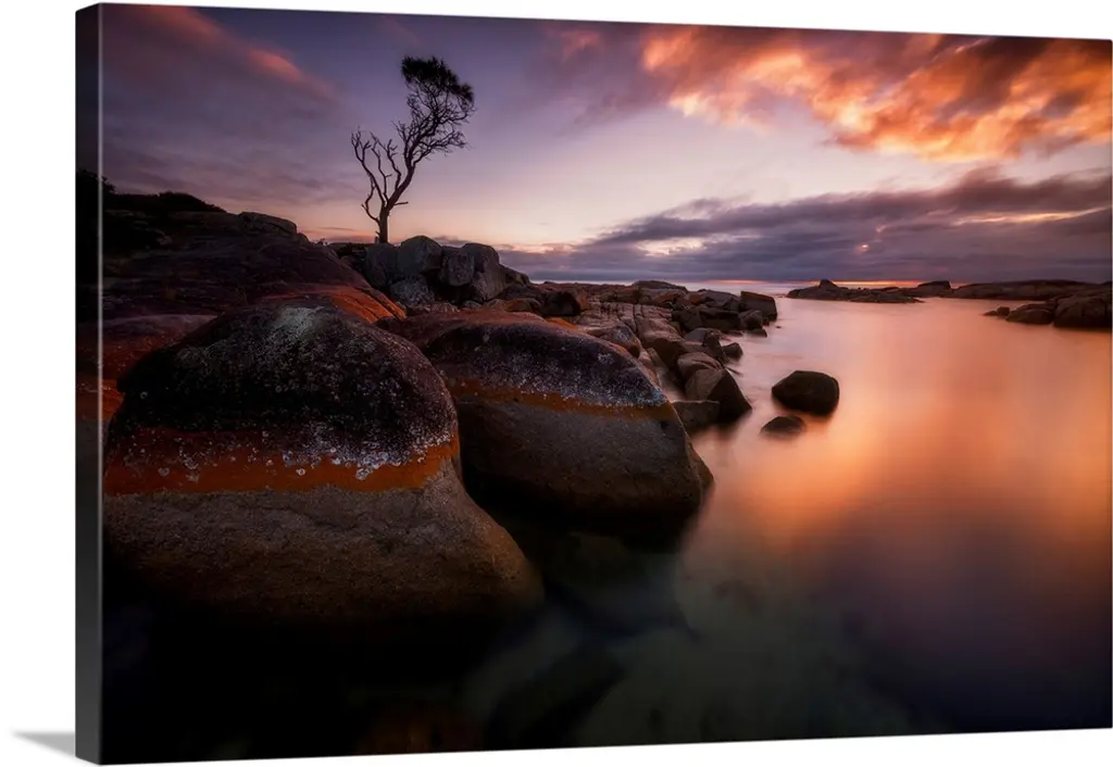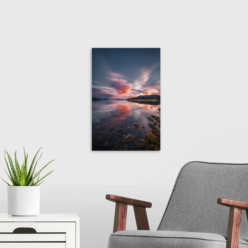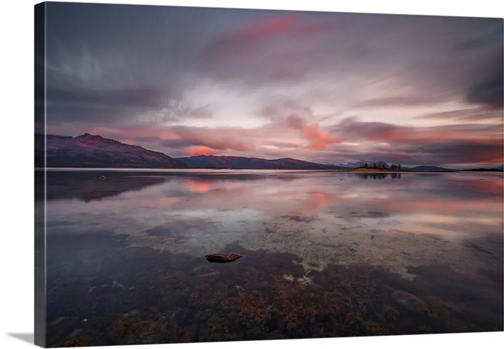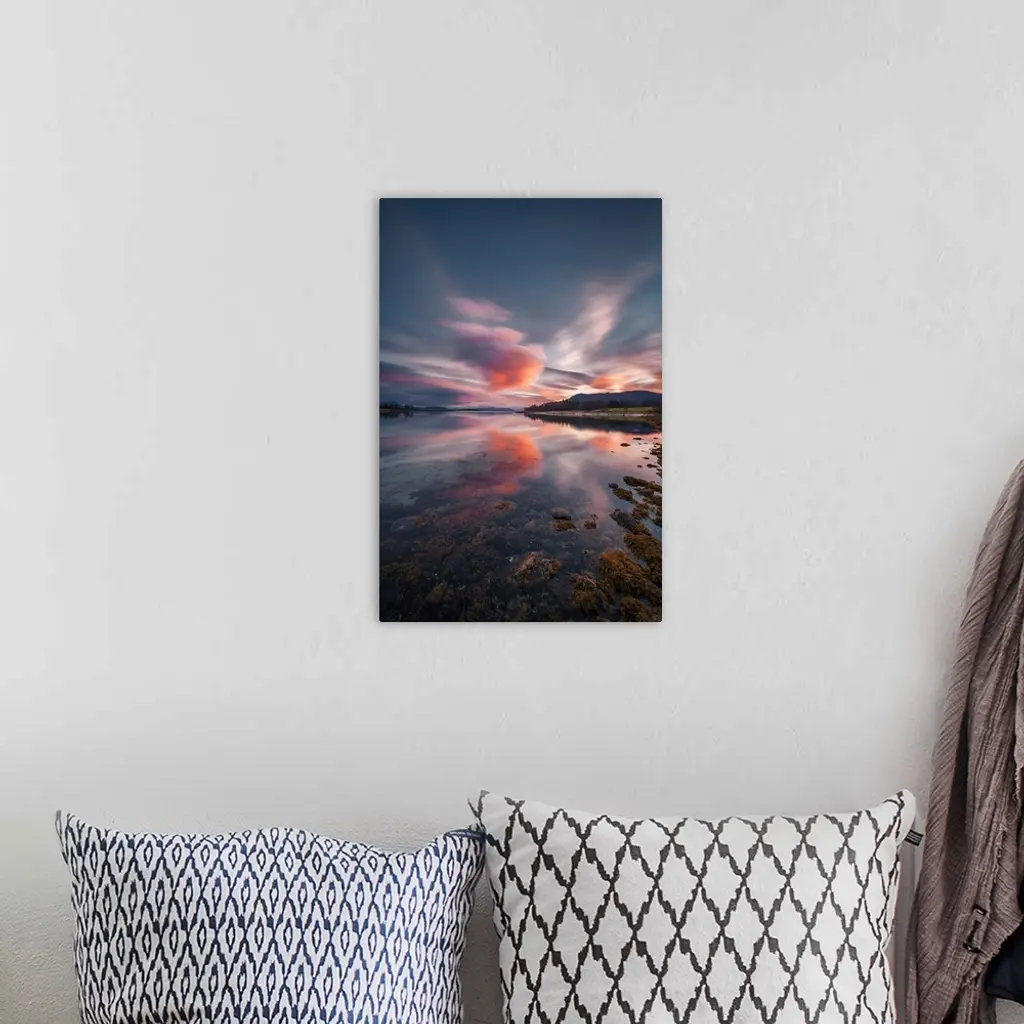 Sunset clouds and its reflection in Lofoten, an archipelago within the Arctic Circle in Norway, known for its scenic landscape.