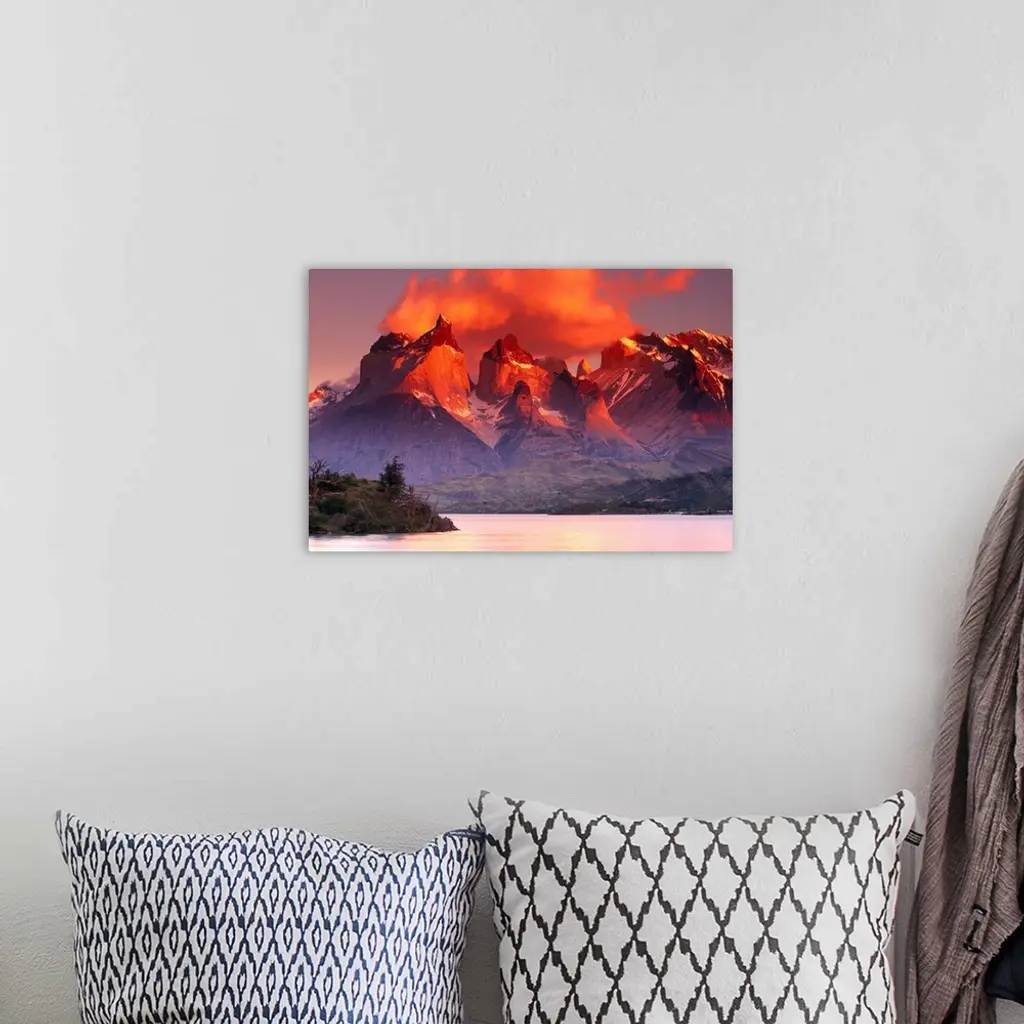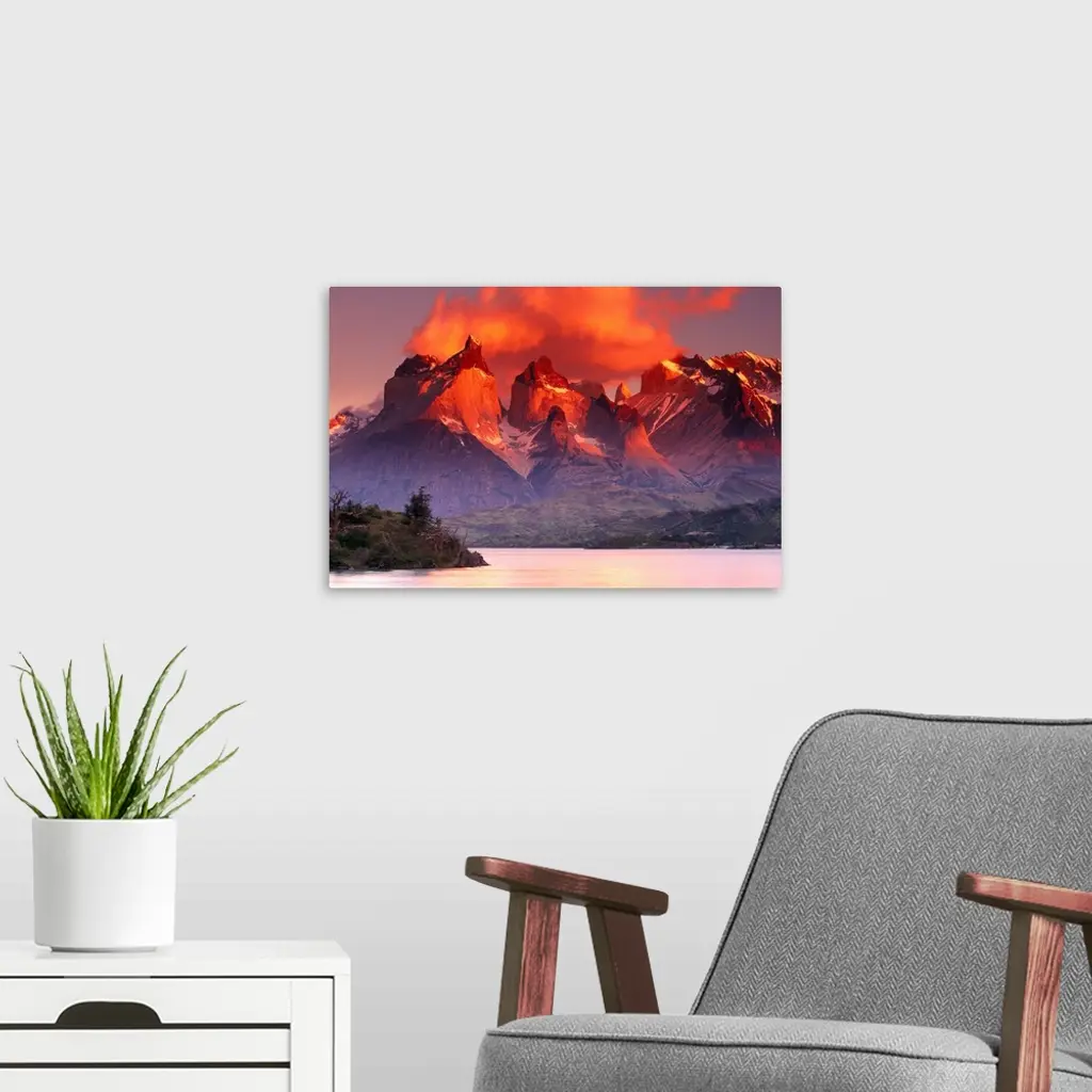 This breathtaking view is of immense mountains that have warm tones at the very top from the sunset sky above.