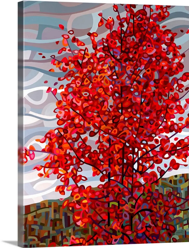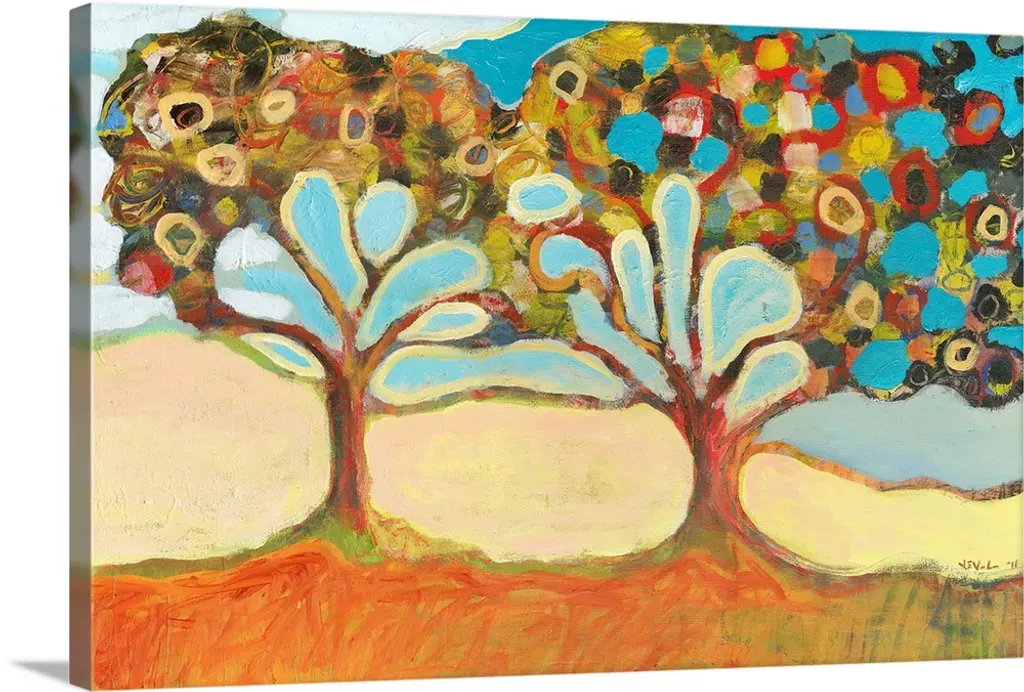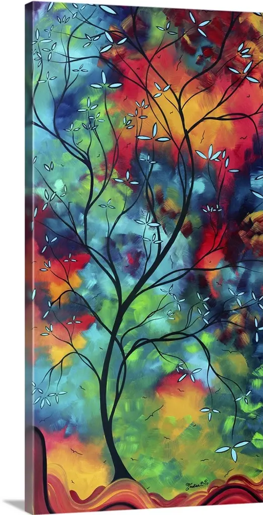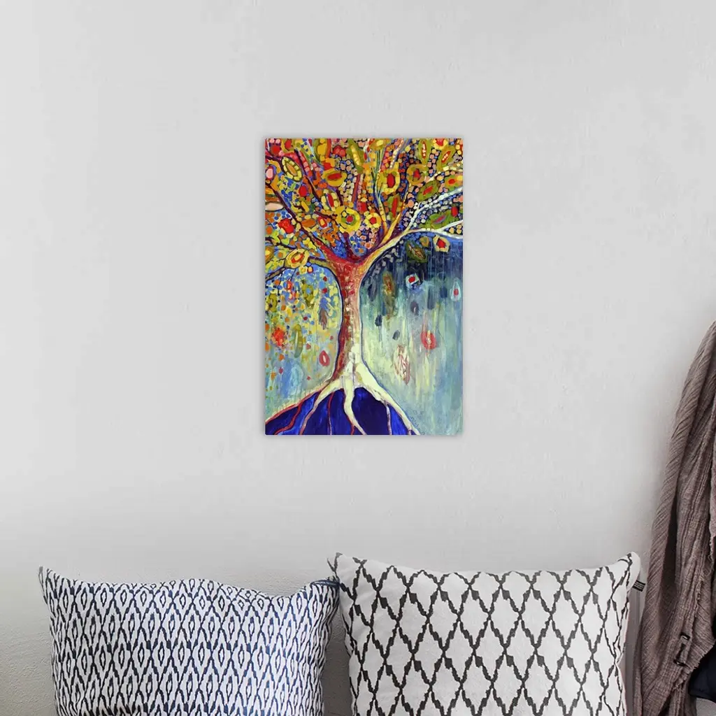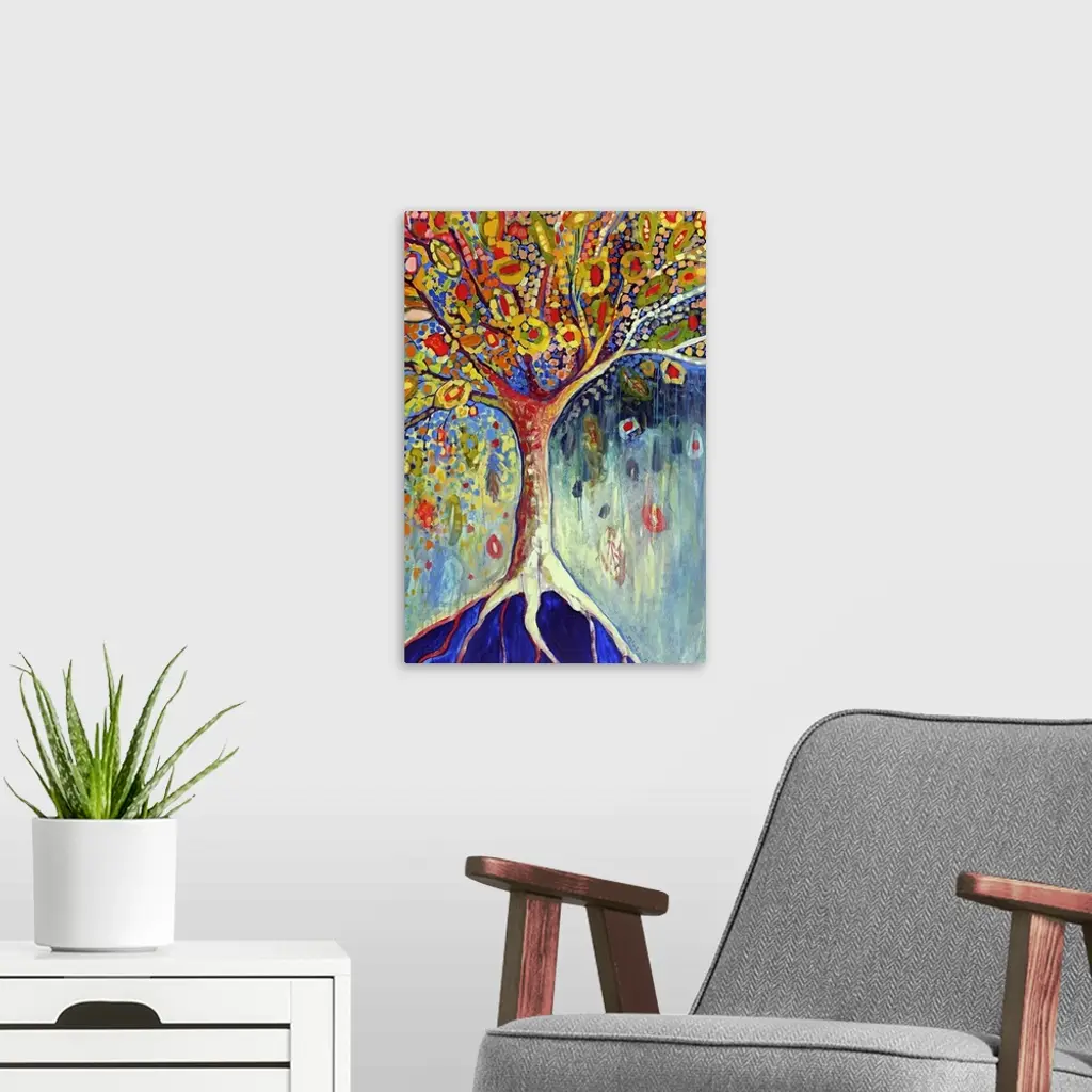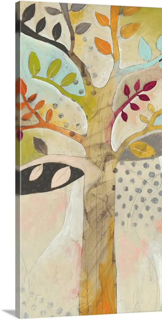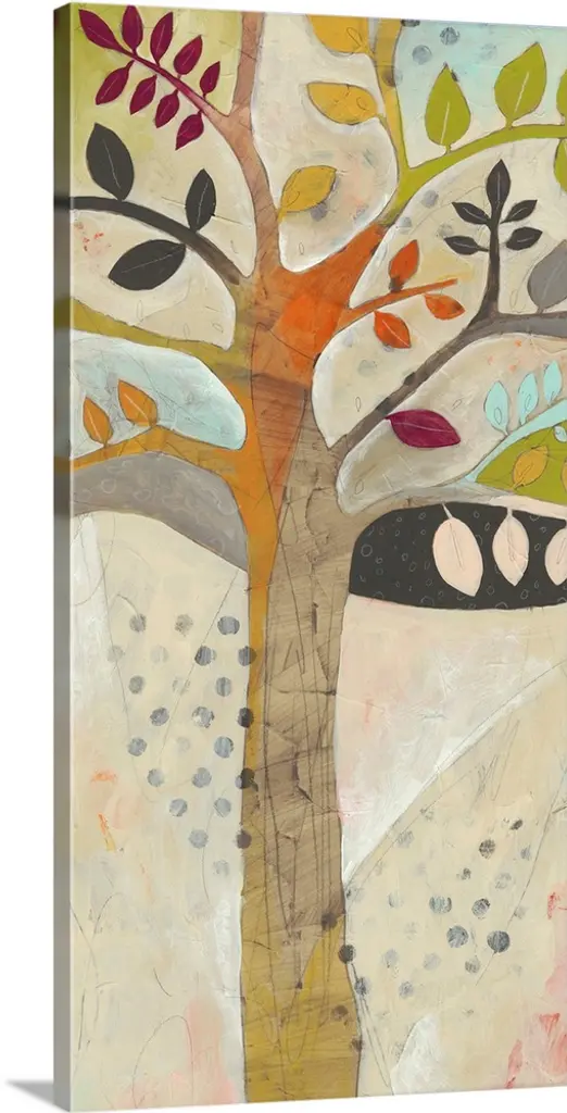 Abstract painted canvas of a tree with long roots and different shaped leaves.