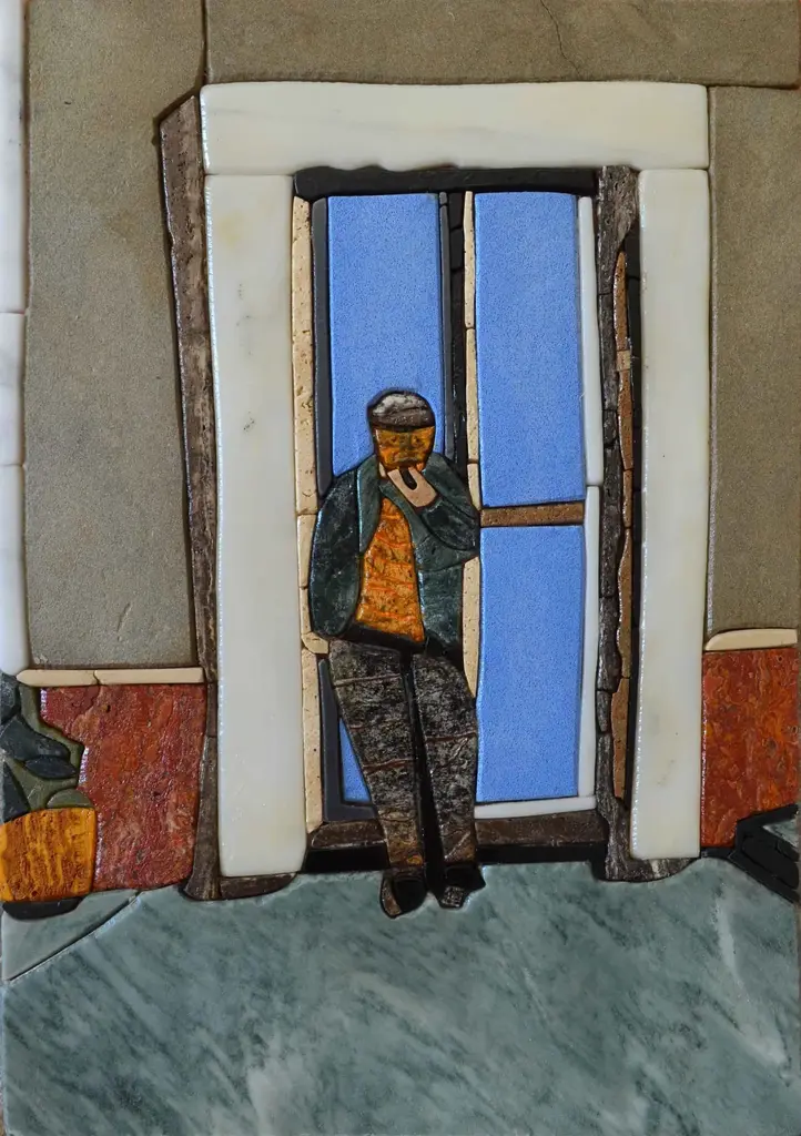 This is a figurative illustration of a man beside a door. The handmade mosaic is composed of all natural stones and can be placed on the wall to decorate your office living room or bed room.