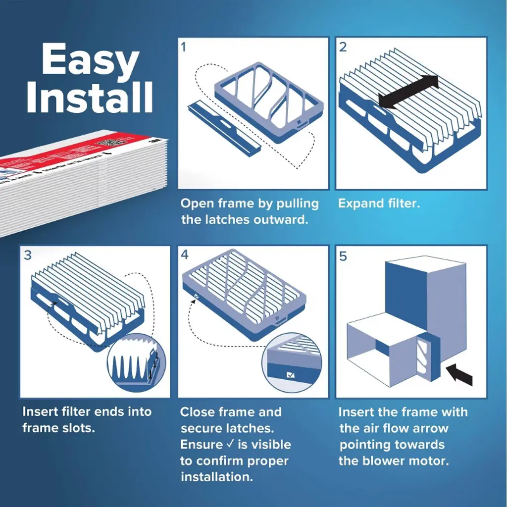 The Filtrete Refillable Air Filter comes with two collapsable air filters. These fit in the Filtrete Brand Refillable Air Filter frame, which is designed to last for up to 20 years. The filter captures 2X more microparticles than the MERV 11 minimum requirements and is Certified Asthma & Allergy Friendly, while creating 20% less waste. Save money on refills with collapsible filters that take up 75% less space than traditional air filters, and are packaged with curbside recyclable materials. The refillable filter lasts up to a year, and never sweat forgetting to replace the filter with 90, 180, and 365-day reminders from the Filtrete Smart App. It's a small change, with a big impact. Excludes damages, abuses, or alterations. Microparticles are 0.3- 1.0 microns in size. Based on weight. Comparable to equivalent size and Filtrete MPR Air Filters, based on MSRP.