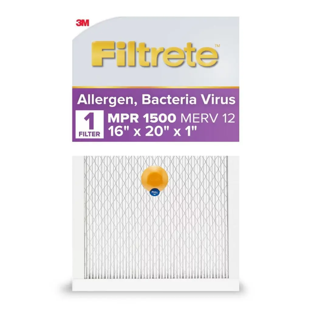 Filtrete 20x25x5 MPR 1550 Air Filter, made by 3M, helps capture unwanted particles and allergens from your household air to contribute to a clean home environment. Designed with exclusive Filtrete 3-in-1 technology, including a high MPR 1550 and MERV 12 rating, your AC filter will help pull and capture countless microparticles – such as pet dander, smoke and smog – while letting cleaner air flow through. This air filter captures up to 50% of small particles (1), like bacteria and particles that carry viruses, to help make your air cleaner. Your Filtrete Filter will also capture large particles, including lint, pollen and household dust. Use a 12-month 5-inch home HVAC filter in your compatible furnace, air conditioner or HVAC system. For optimal performance of your HVAC system, change your 5-inch furnace filter at least once per year. Fits systems calling for a filter thickness of 4.75" and larger. Filtrete Brand is North America’s most trusted brand of HVAC Filters (2). (1) % captured is based on ASHRAE 52.2 testing for 0.3 to 1 micron particles from the air passing through the filter, which relates to HVAC industry standard efficiency testing. (2) Based on 2024 Sago US Brand Health Survey of Residential HVAC Air Filters (3) As outlined in report ASCR: 1246-01.