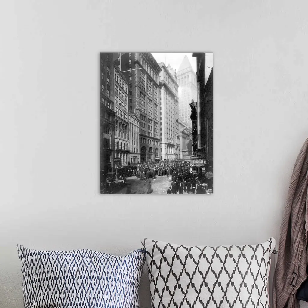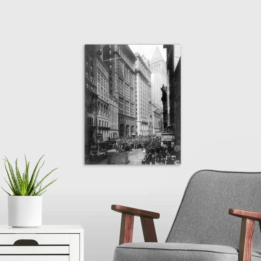 Crowd of men involved in curb exchange trading on Broad Street, New York City. Photograph, c1920.