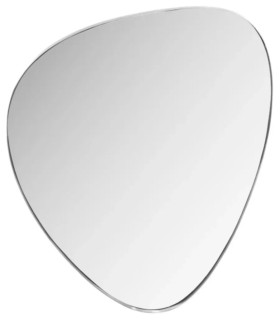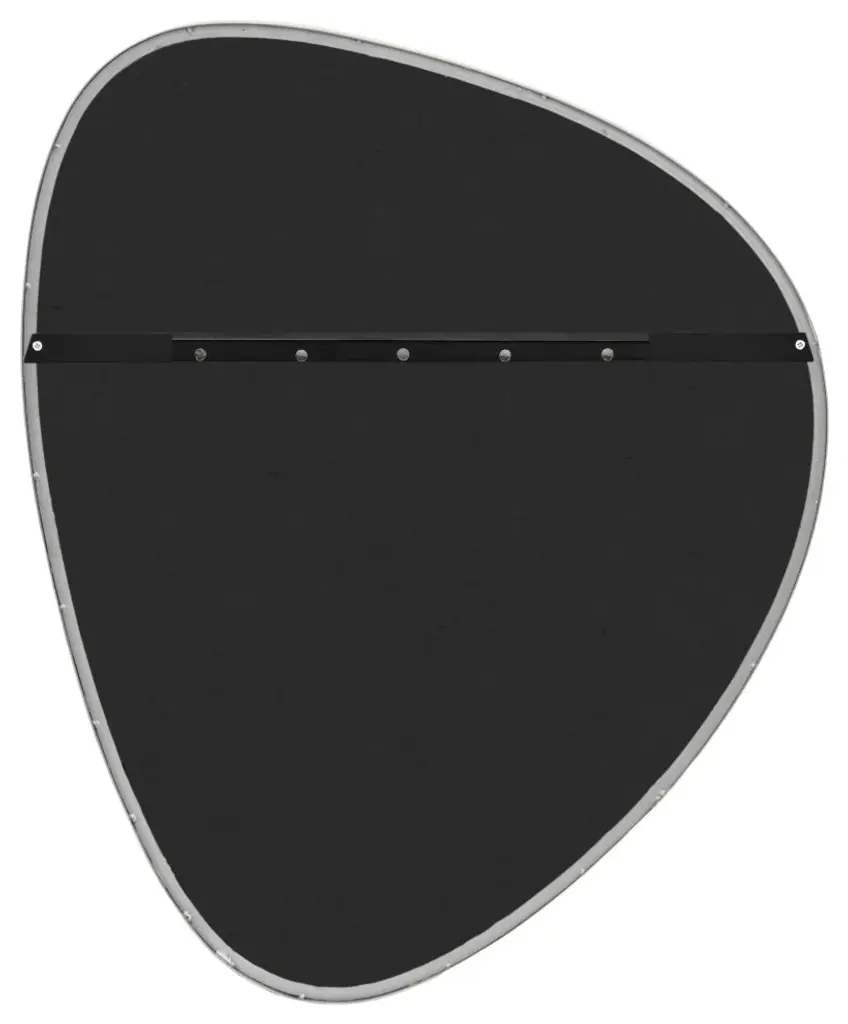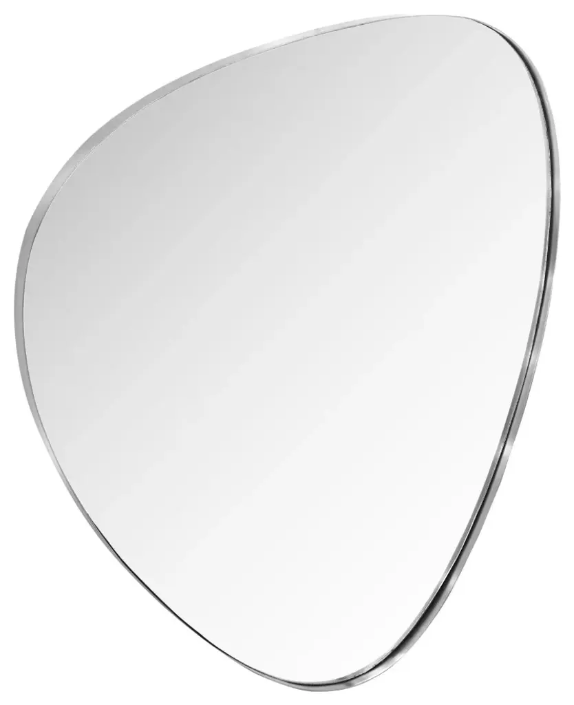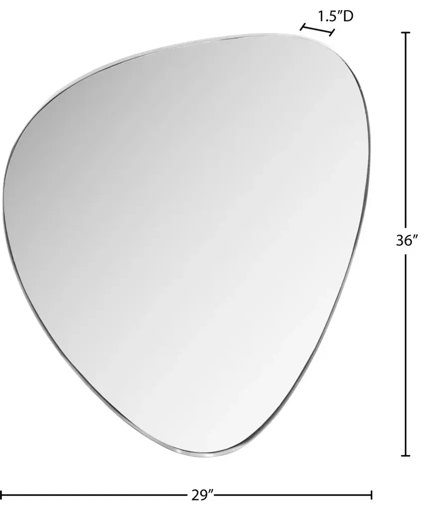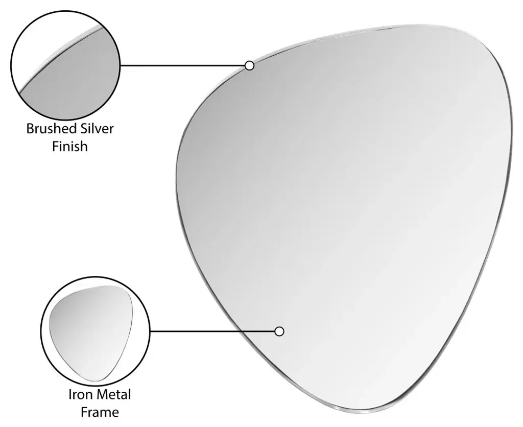 Count on this Finch silver mirror to reflect your good taste and remarkable style. This artfully designed mirror brings a bit of the art gallery to your home space with its unique shape and simple design. An iron metal frame with a brushed silver finish ensures an eye-grabbing look that instantly draws attention from the moment family and friends enter your room. Use it as a standalone focal point on a large wall or hang it above a bathroom vanity or dressing table for added oomph.Overall Product Dimensions: 29" W x 1.5" D x 36" HBrushed Silver FinishIron Metal FramePebble ShapeContemporary Design