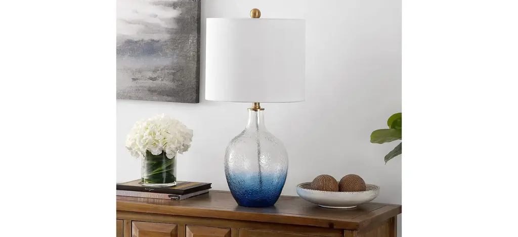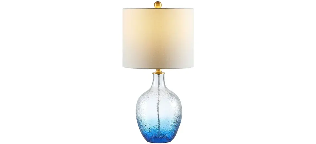 Evoking the beauty of the ocean's horizon meeting a clear day's sky, this Finnley Table Lamp is a captivating decorative accent. Finnley's textured ombre blue glass shimmers when struck by light, giving any interior a flowing sense of depth and motion. A contemporary masterpiece of artisan glasswork.