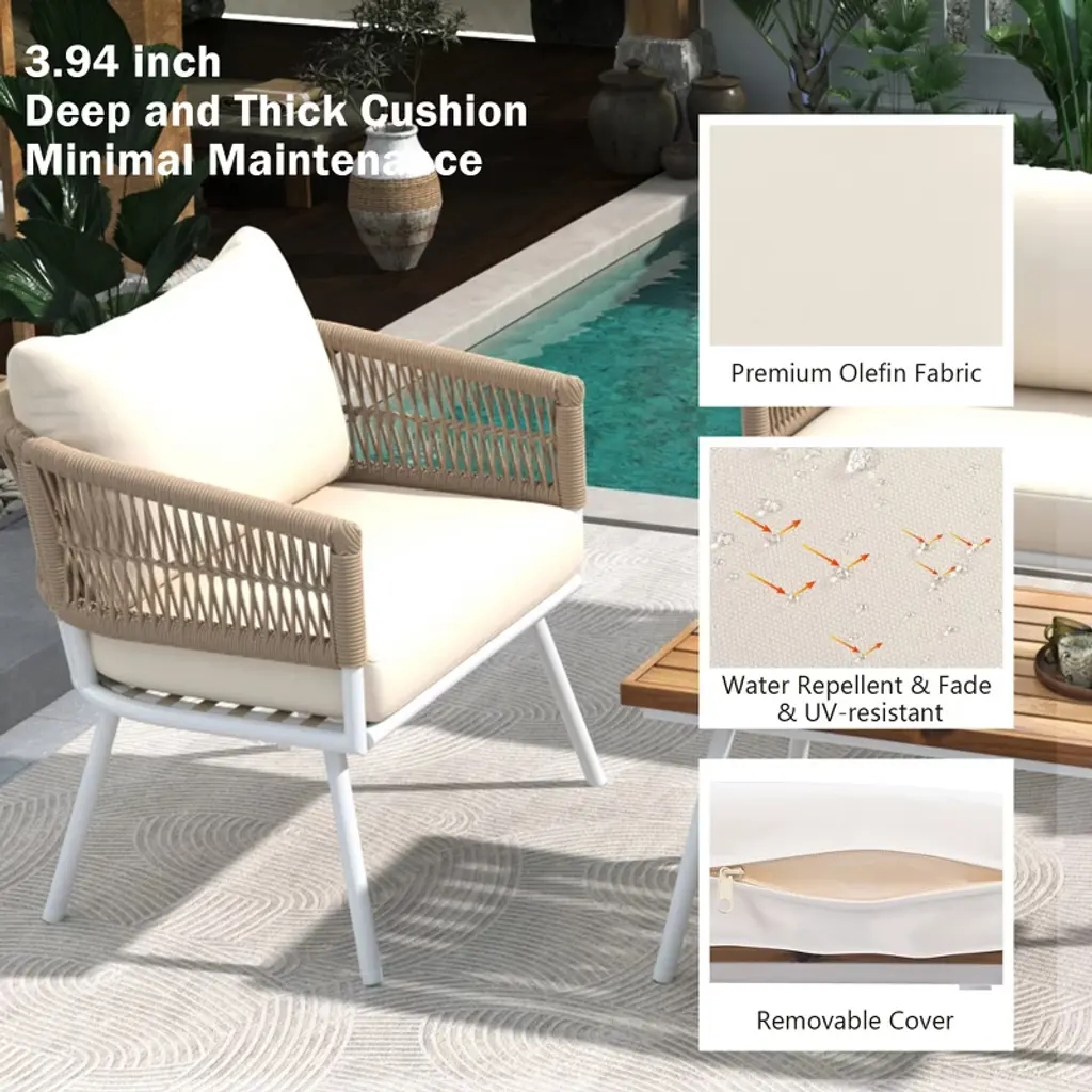 Fioneca 4-piece Boho Rope Patio Furniture Set With Acacia Wood Table, Outdoor Conversation Sofa Set With Cushions For Backyard, Porch, Beige