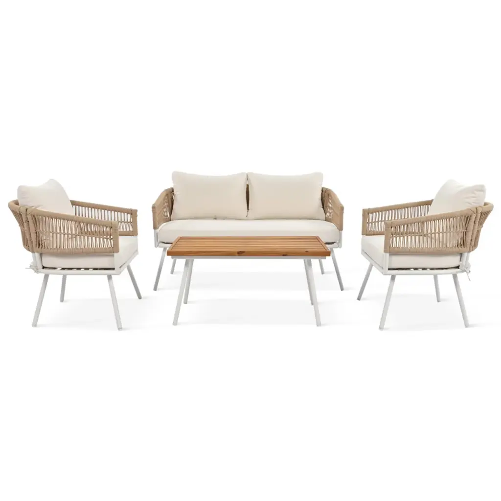 Bring bohemian charm and comfort to your outdoor space with this 4-piece rope patio furniture set. Featuring a durable acacia wood table and handwoven rope design, this set combines style with strength. Deep seating and thick cushions provide superior comfort, making it perfect for relaxing or entertaining on your porch, balcony, or backyard.