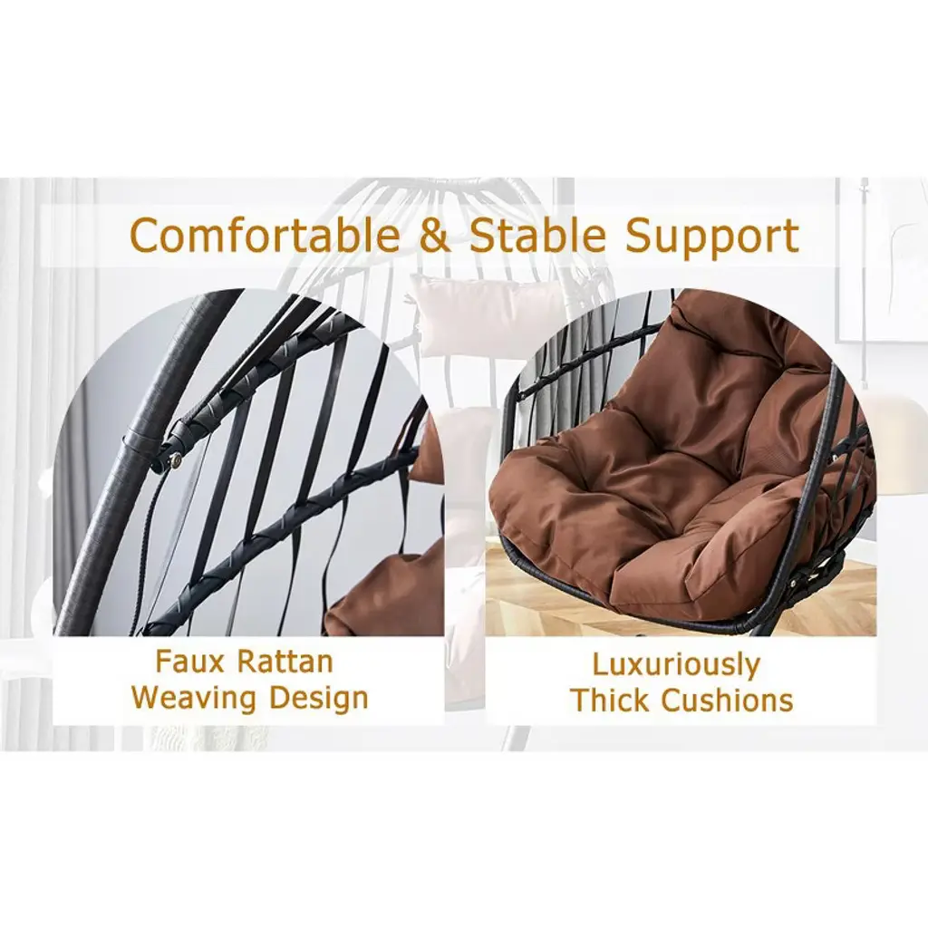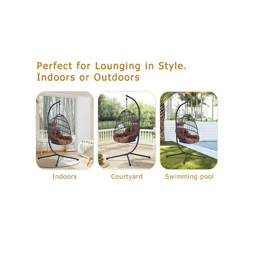 Relax in modern boho comfort with this indoor/outdoor egg swing chair. Made with all-weather gray PE wicker and a stylish rope back design, this chair features a foldable steel frame and comes complete with plush cushions and a protective cover. Whether on the porch, in the garden, or in your bedroom, it¡¯s the perfect spot to lounge in style and serenity.
