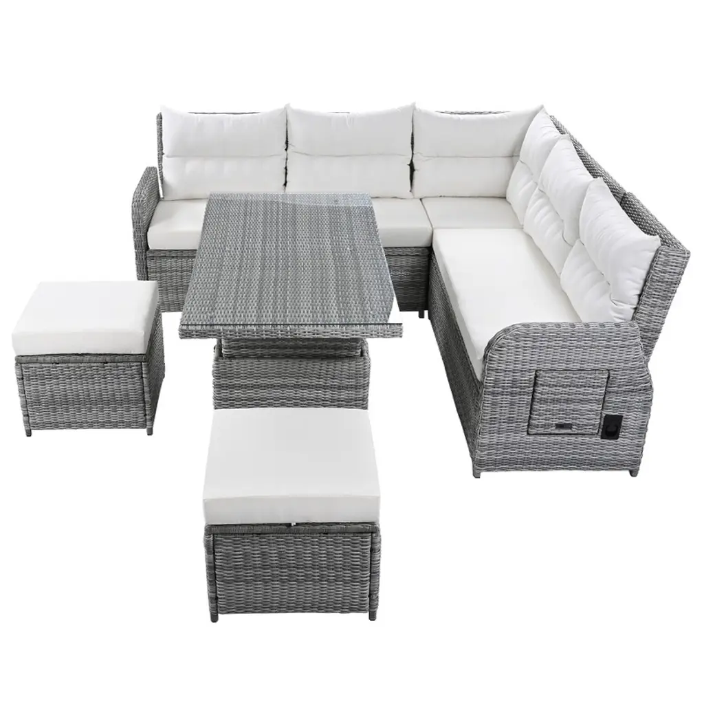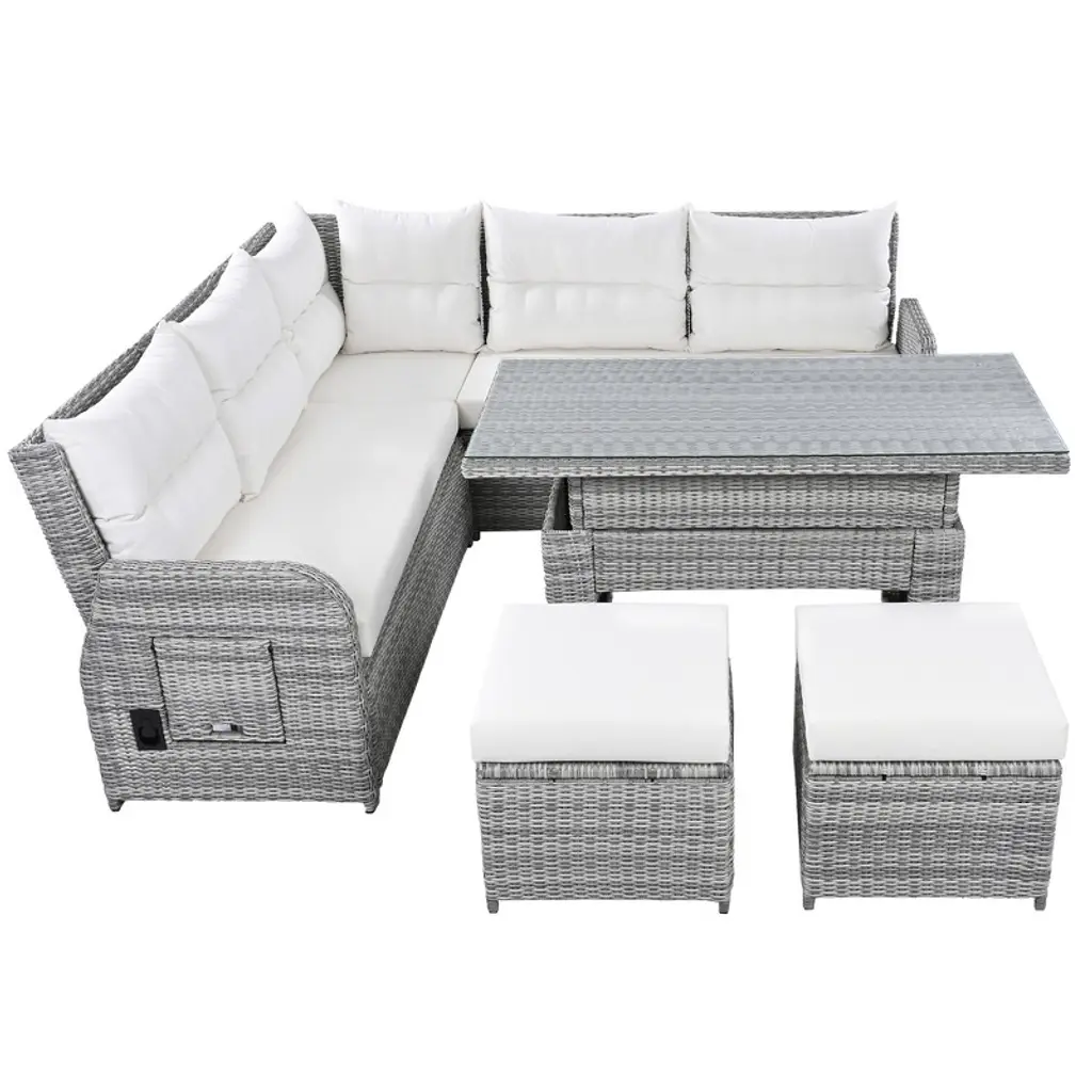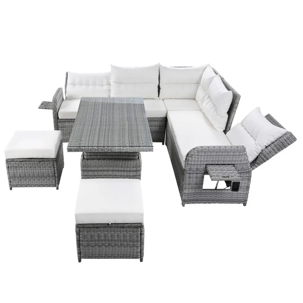Upgrade your outdoor space with this versatile patio rattan furniture set. Featuring two recliners with extendable side tables, a height-adjustable central table, and two comfortable ottomans, this beige set is perfect for relaxing or entertaining. Crafted from durable PE rattan, it¡¯s designed to withstand all weather conditions, making it ideal for patios, lawns, backyards, or poolside areas.
