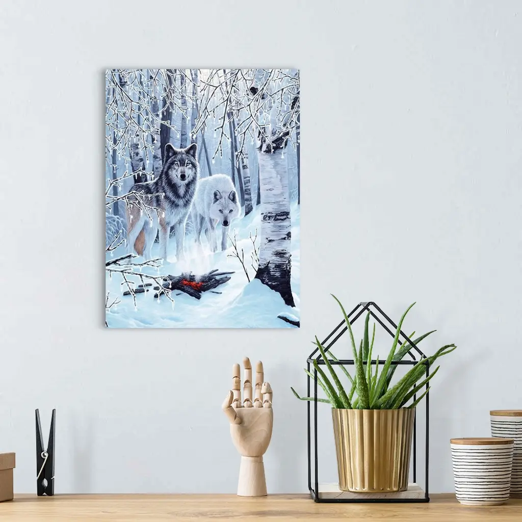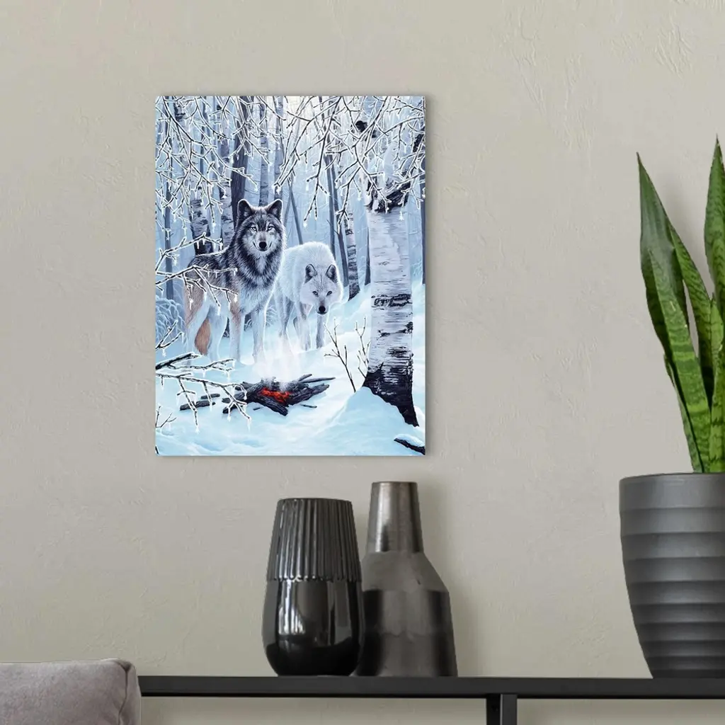 Two wolves stand under a group of birch trees, next to a campfire, on a snow covered ground.