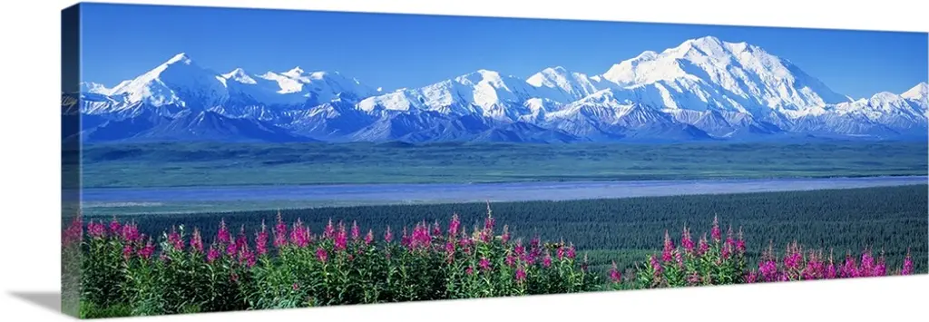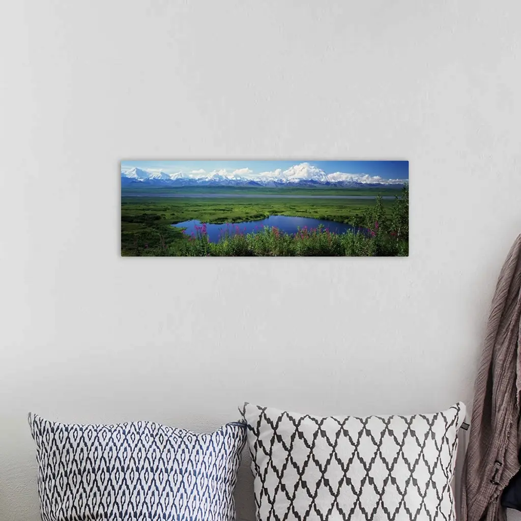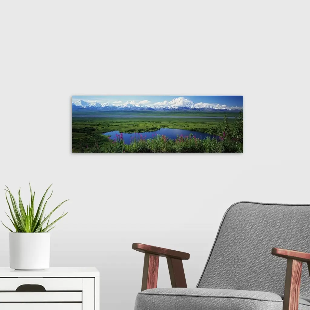 View of the Alaskan wilderness, with wildflowers in the foreground, small ponds, and a mountain range full of snowy peaks.