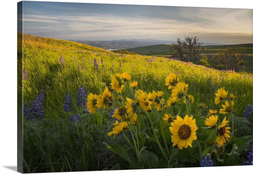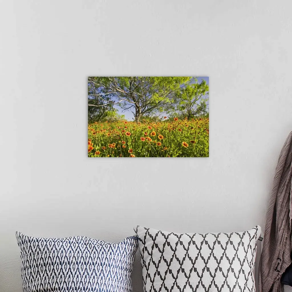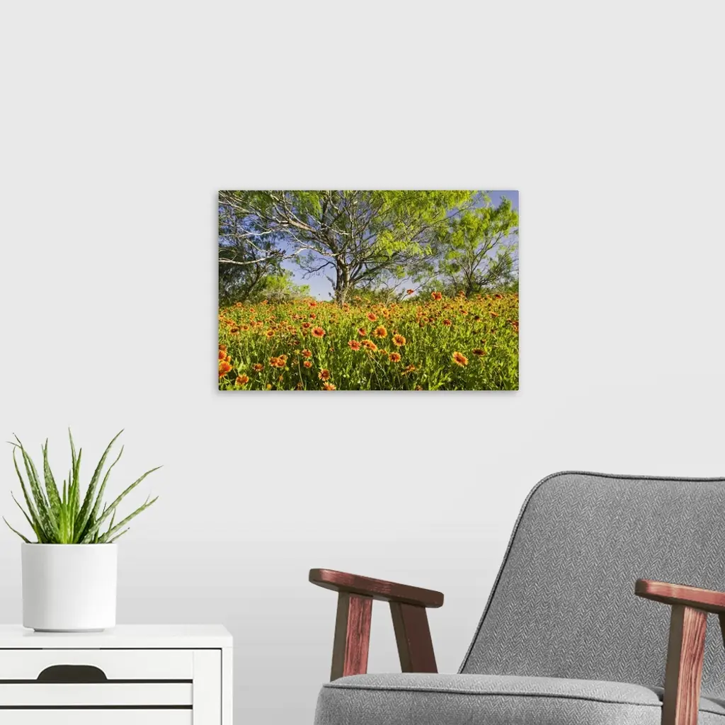 Firewheels (Gaillardia pulchella) wildflowers growing in mesquite trees, s. Texas, USA, spring