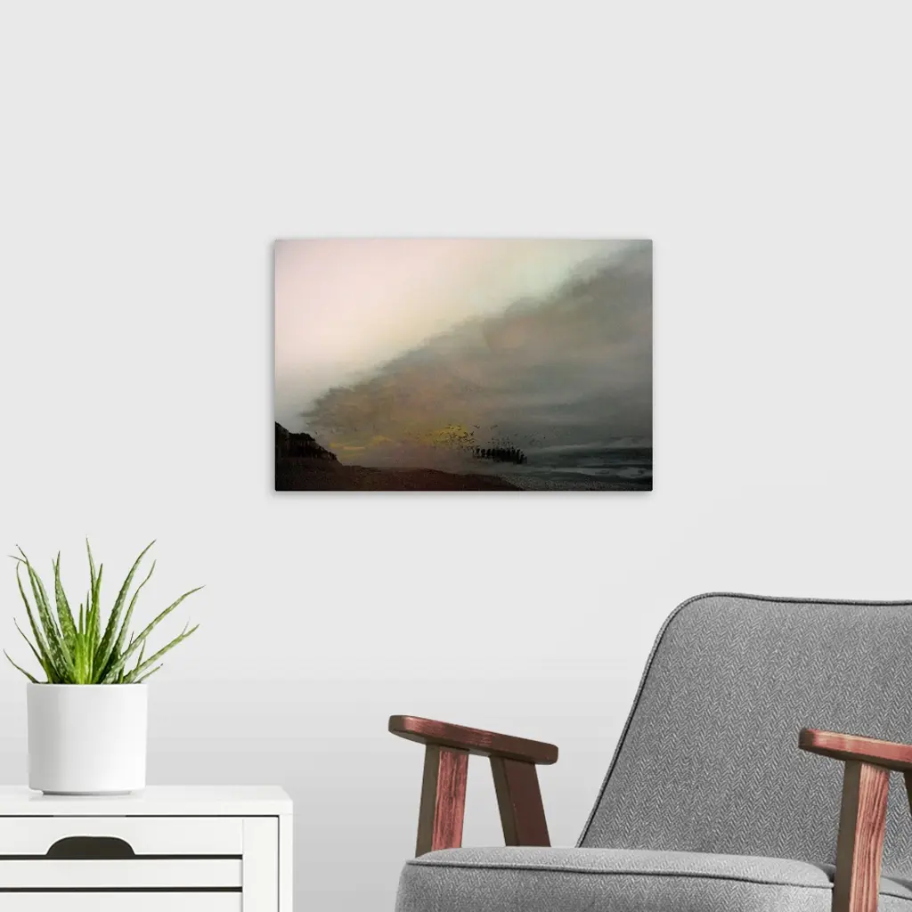 Conceptual photograph of a large flock of birds flying over a fishing boat in the water, created with multiple layers giving it an abstract look.