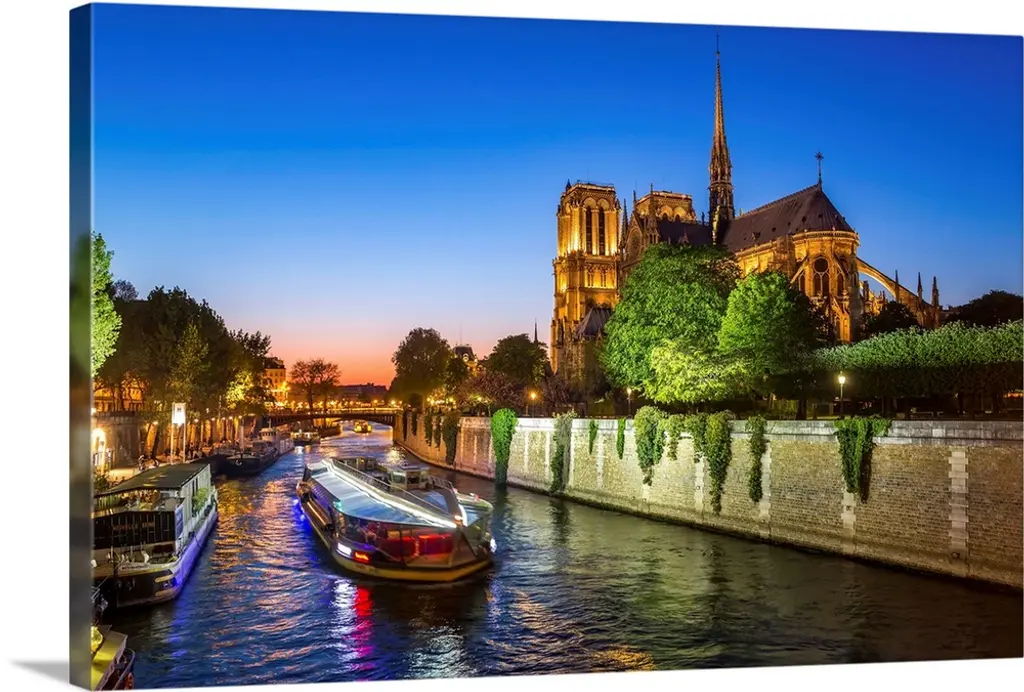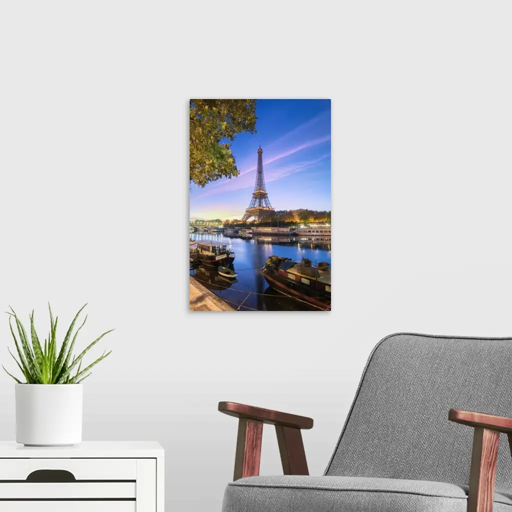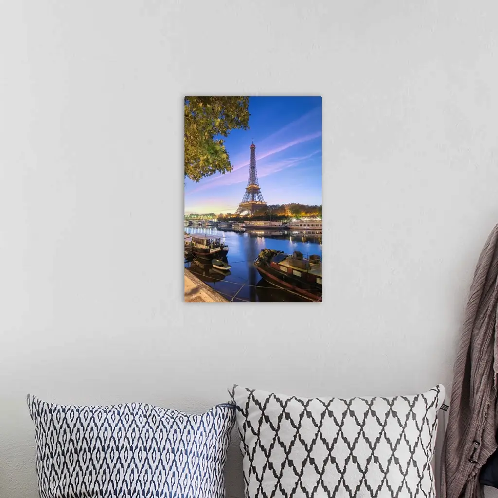 Morning summer first lights on the Eiffel tower in Paris, France. Some boats and trees facing the iron lady.
