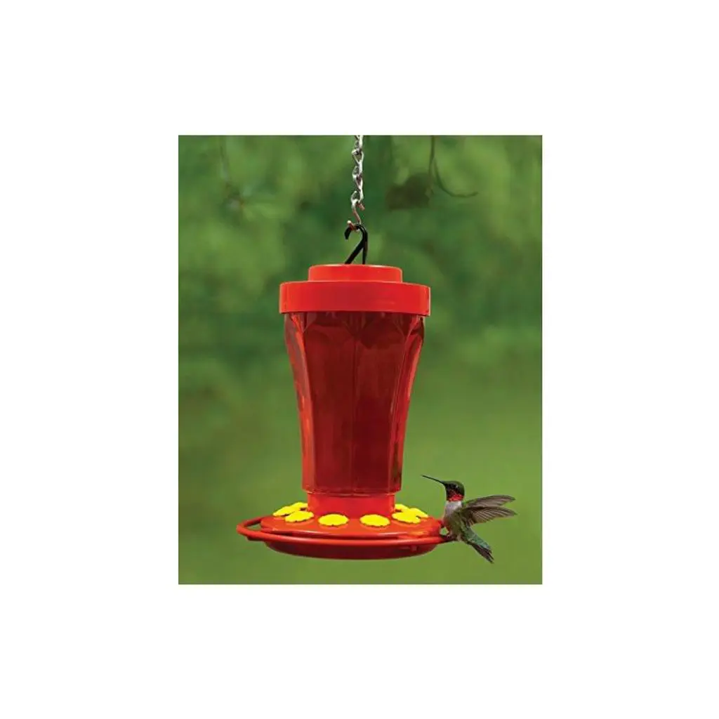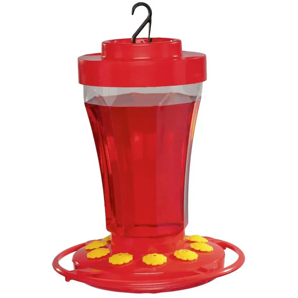 First Nature’s 32 oz. Hummingbird Flower Feeder’s red base with attractive yellow flowers really draws the birds and the yellow flowers discourage bees and wasps from entering the feeder. The perch provides the perfect position for birds to comfortably feed at any of the ten ports. The plastic wide-mouth fluted reservoir is easy to fill and easy to clean. The patented two-part base twists apart for thorough cleaning. All parts may be washed in warm soapy water. (Do not put any parts of this feeder in a dishwasher.) We recommend you use First Nature’s Hummingbird Nectar Concentrate which you can easily mix right in the reservoir.