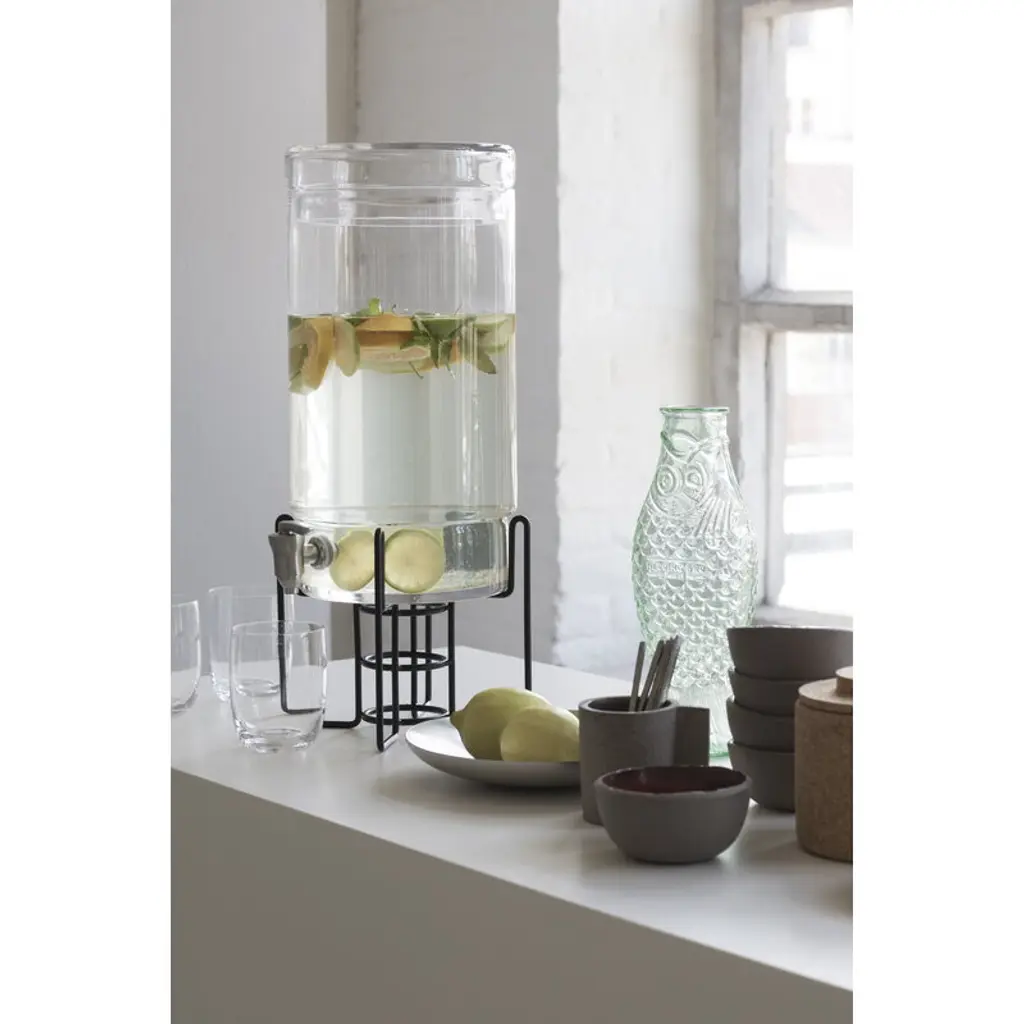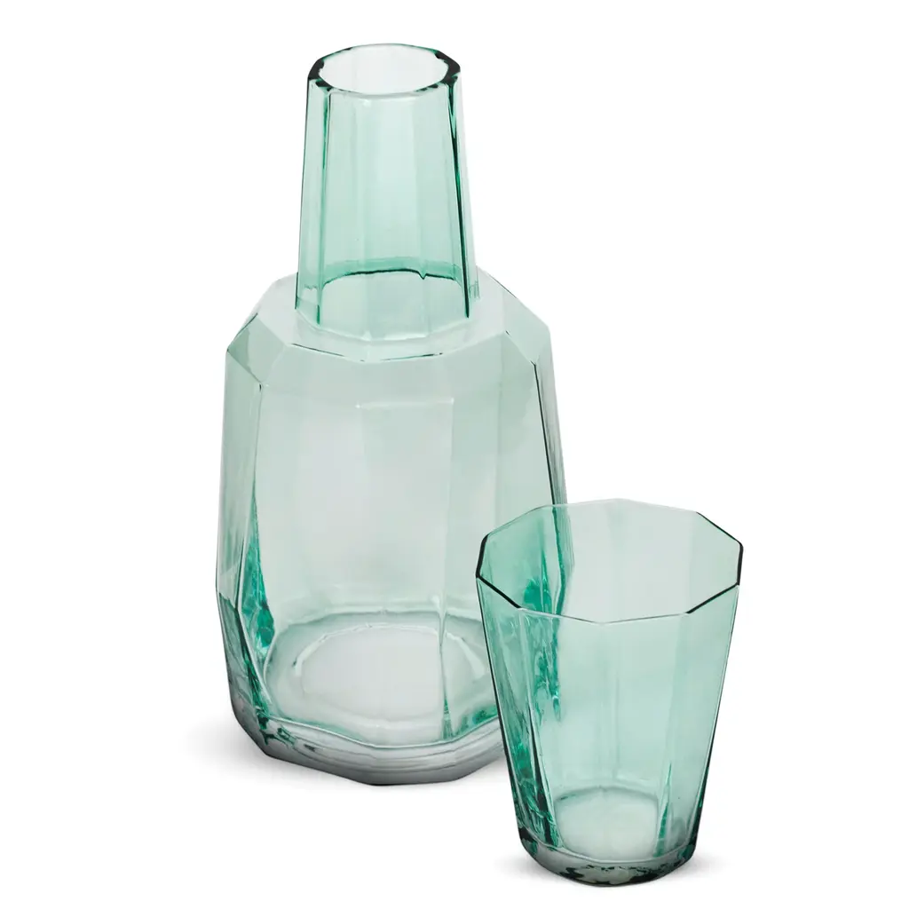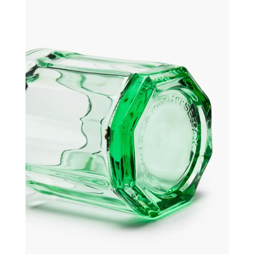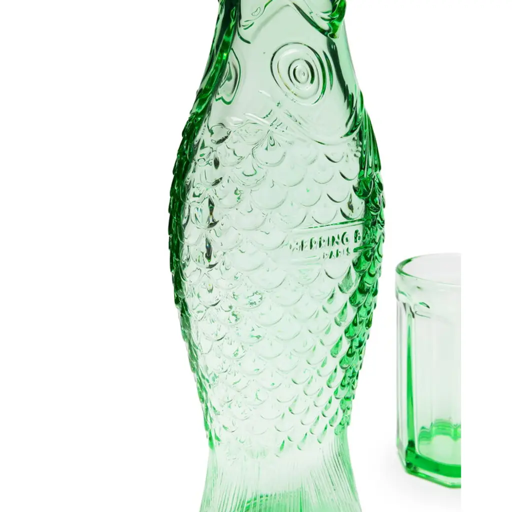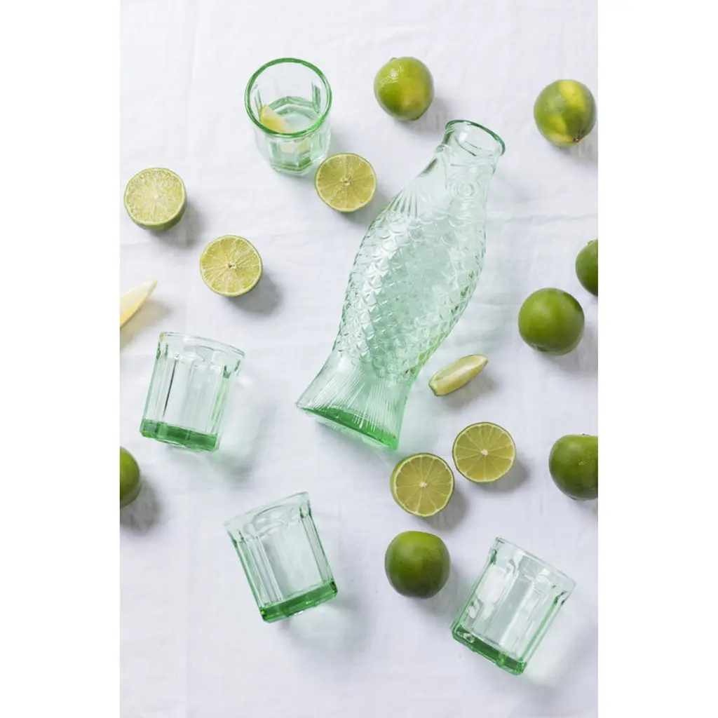Serax's Fish & Fish set includes a 0.85-liter carafe and four 0.22-liter drinking glasses. The Fish & Fish bottle charms with its fish-like appearance and distinctive, delicate green glass. Resembling a herring, the playful bottle can be used as a carafe for serving drinks or as a vase for flowers but it also brings joy as a decorative object as such. The Fish & Fish glass is suitable for both everyday life and special occasions. The greenish glass is decorated with delicate grooves. Designed by Paola Navone, the Fish & Fish collection brightens up the table setting with a good mood and a hint of color.