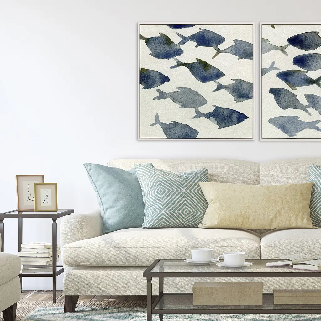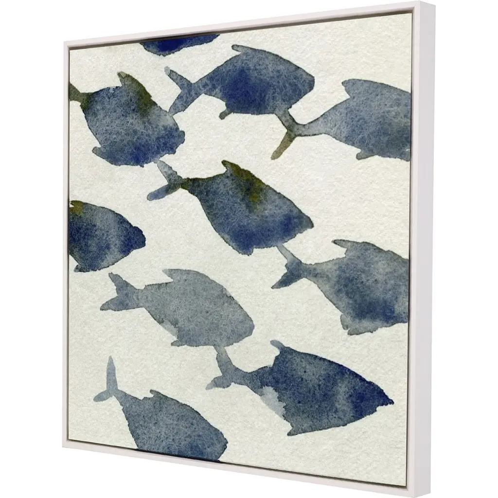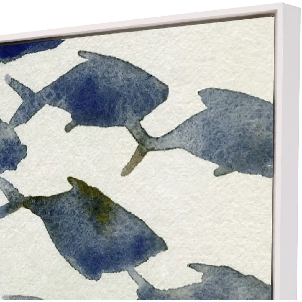 A school of fish drift along for a swimmingly good time. Canvas is mounted in a matte white wood floater frame.