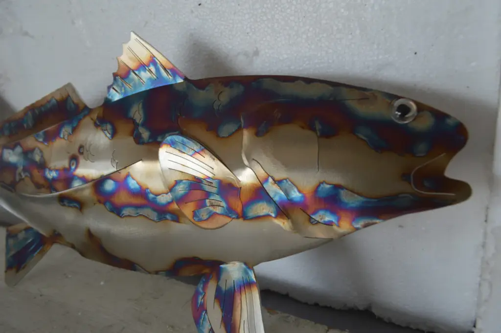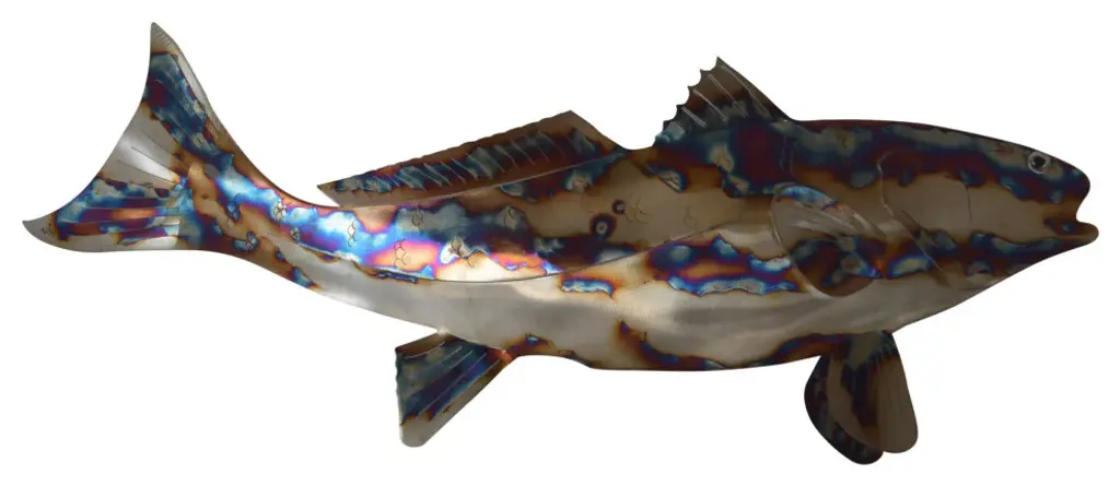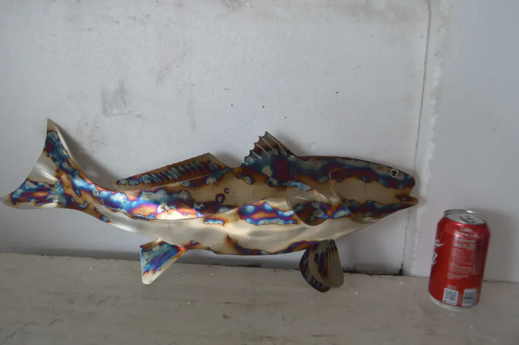 This curved fish is crafted using laser cut steel and can be mounted on any wall desiring a nautical addition. The immense detail is present from the iridescent color to curvature of the body. The piece is both realistic looking and unique in design. This work of art would pair well with any of the other nautical mounted wall art. Size: 25"L x 2"W x 9"H. Weight is: 2Lb