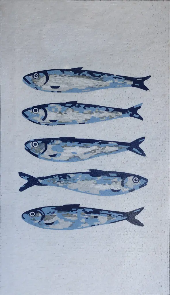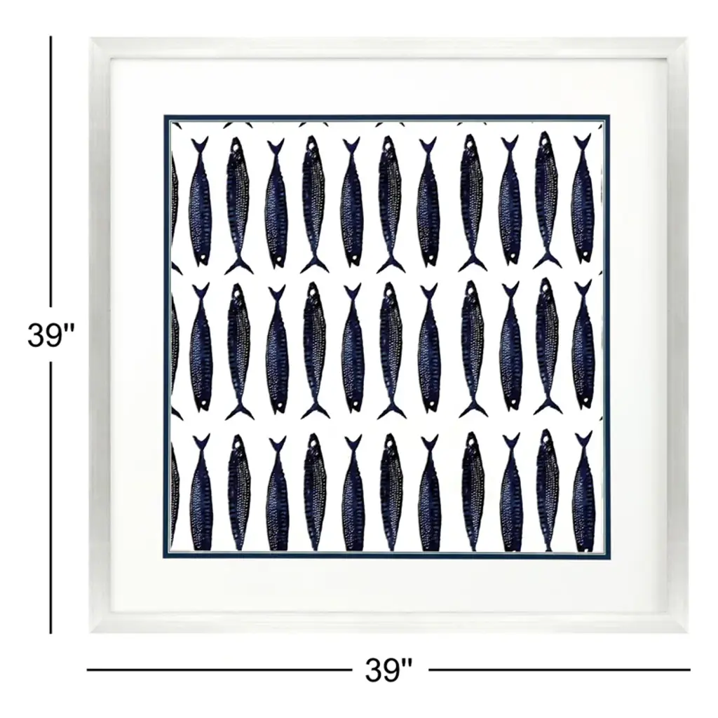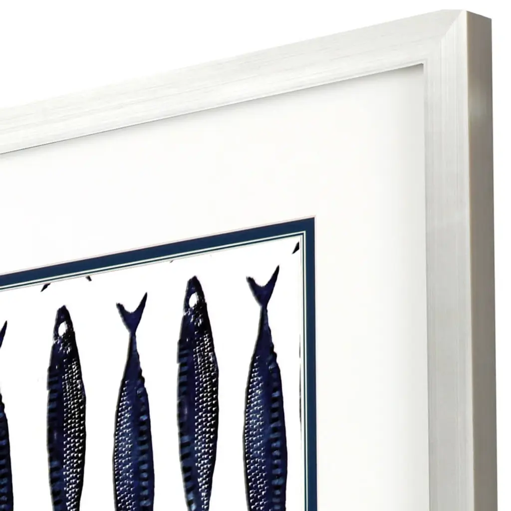 Fish line up to give this art a contemporary vibe for a modern coastal look. Matted in white and framed in a silver leaf block profile wood.