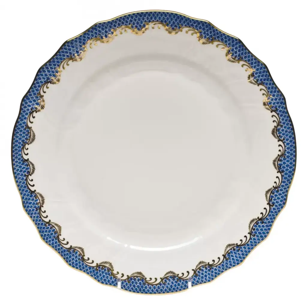 While it has often been used as a complement to Herend's patterns, this dramatic decorative border really comes into its own when it gets top billing. Fish scale is available in multiple shapes in 8 colors: raspberry, rust, brown, gold, two shades of blue and two shades of green. Hand painted in Hungary. Now the biggest porcelain manufactory in Europe, Herend was founded in 1826 to produce earthenware in the small Hungarian village for which it was named. At the time, Hungary was flooded with low-cost pottery, but in 1839, Mor Fischer became the Manufactory’s new owner and he decided to focus on producing dinnerware replacement pieces for Europe’s royal families to complement their valuable porcelain patterns from Germany and the Far East. As his client base grew, Fischer commissioned his artists to begin designing dinnerware patterns of their own. Queen Victoria’s 1851 purchase of a large set for Windsor Castle was a milestone, setting the stage for aristocrats throughout Europe to clamor for Herend in their estates. In the 1850s, Herend added meticulously-crafted figurines to its creations. Herend’s trademark fishnet pattern, which is widely recognized and prized as Herend’s signature design, started in 1858 when an artist who was intrigued with a Chinese plate’s fish scale design painted it onto a rooster figurine to imitate feathers.