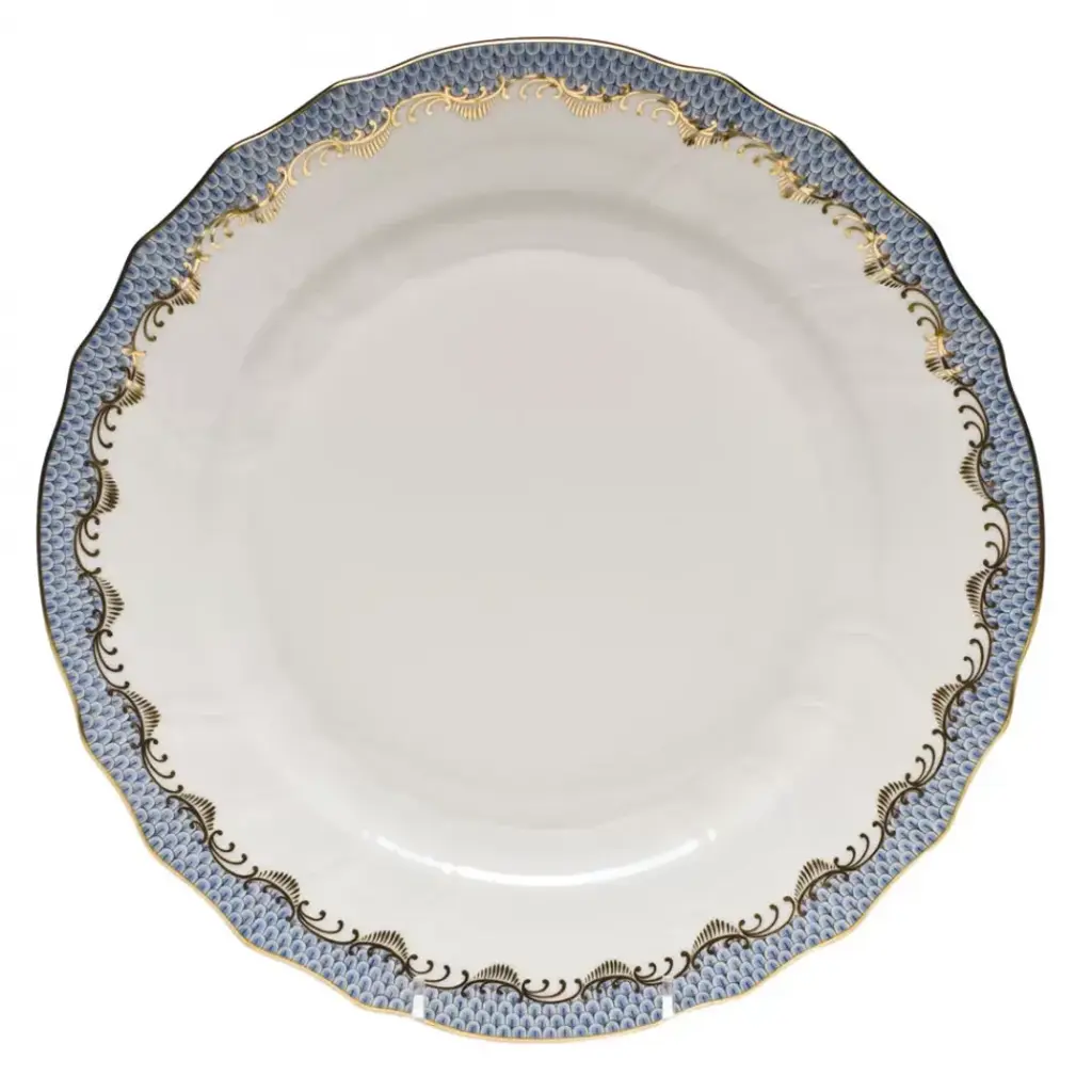 While it has often been used as a complement to Herend's patterns, this dramatic decorative border really comes into its own when it gets top billing. Fish scale is available in multiple shapes in 8 colors: raspberry, rust, brown, gold, two shades of blue and two shades of green. Hand painted in Hungary. Now the biggest porcelain manufactory in Europe, Herend was founded in 1826 to produce earthenware in the small Hungarian village for which it was named. At the time, Hungary was flooded with low-cost pottery, but in 1839, Mor Fischer became the Manufactory’s new owner and he decided to focus on producing dinnerware replacement pieces for Europe’s royal families to complement their valuable porcelain patterns from Germany and the Far East. As his client base grew, Fischer commissioned his artists to begin designing dinnerware patterns of their own. Queen Victoria’s 1851 purchase of a large set for Windsor Castle was a milestone, setting the stage for aristocrats throughout Europe to clamor for Herend in their estates. In the 1850s, Herend added meticulously-crafted figurines to its creations. Herend’s trademark fishnet pattern, which is widely recognized and prized as Herend’s signature design, started in 1858 when an artist who was intrigued with a Chinese plate’s fish scale design painted it onto a rooster figurine to imitate feathers.
