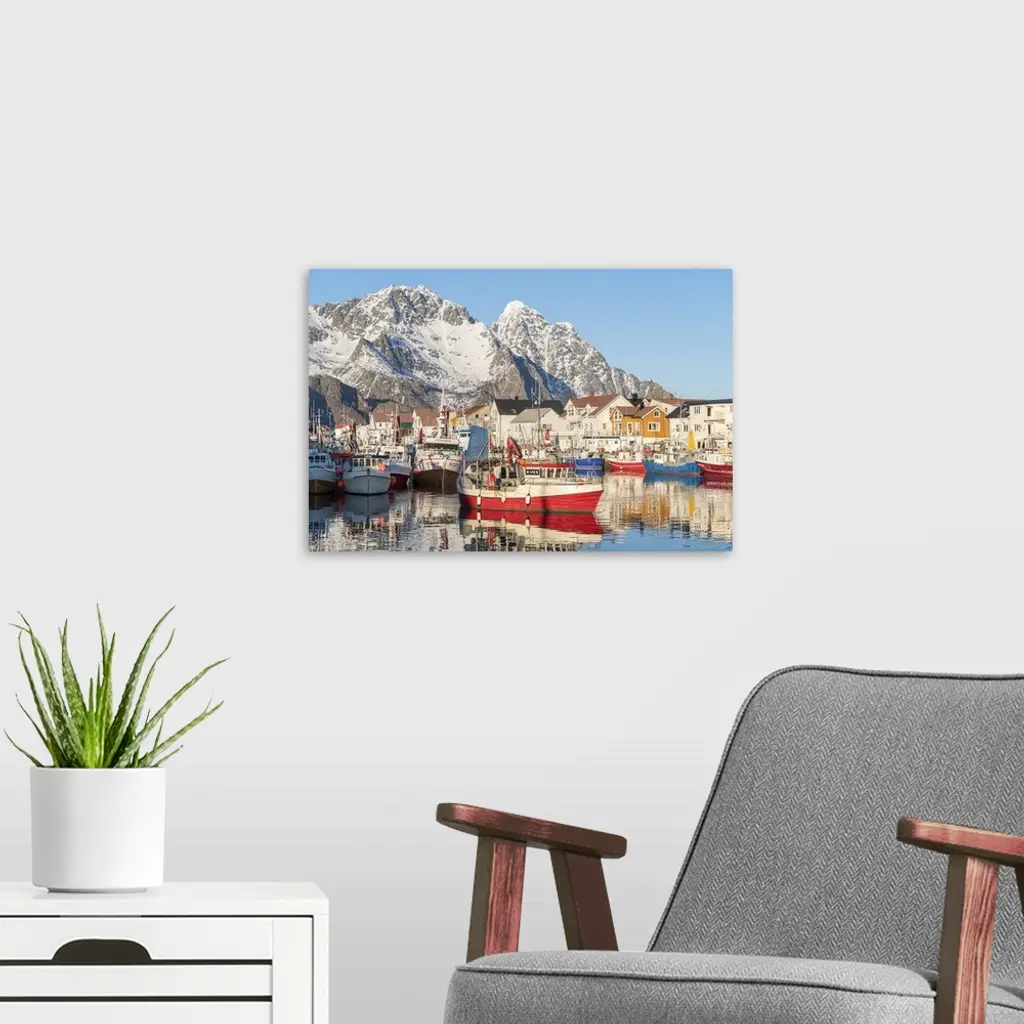 Fishing boats in the harbour, with snowcapped mountains in the background. Henningsvaer, Nordland county, Northern Norway region, Norway.