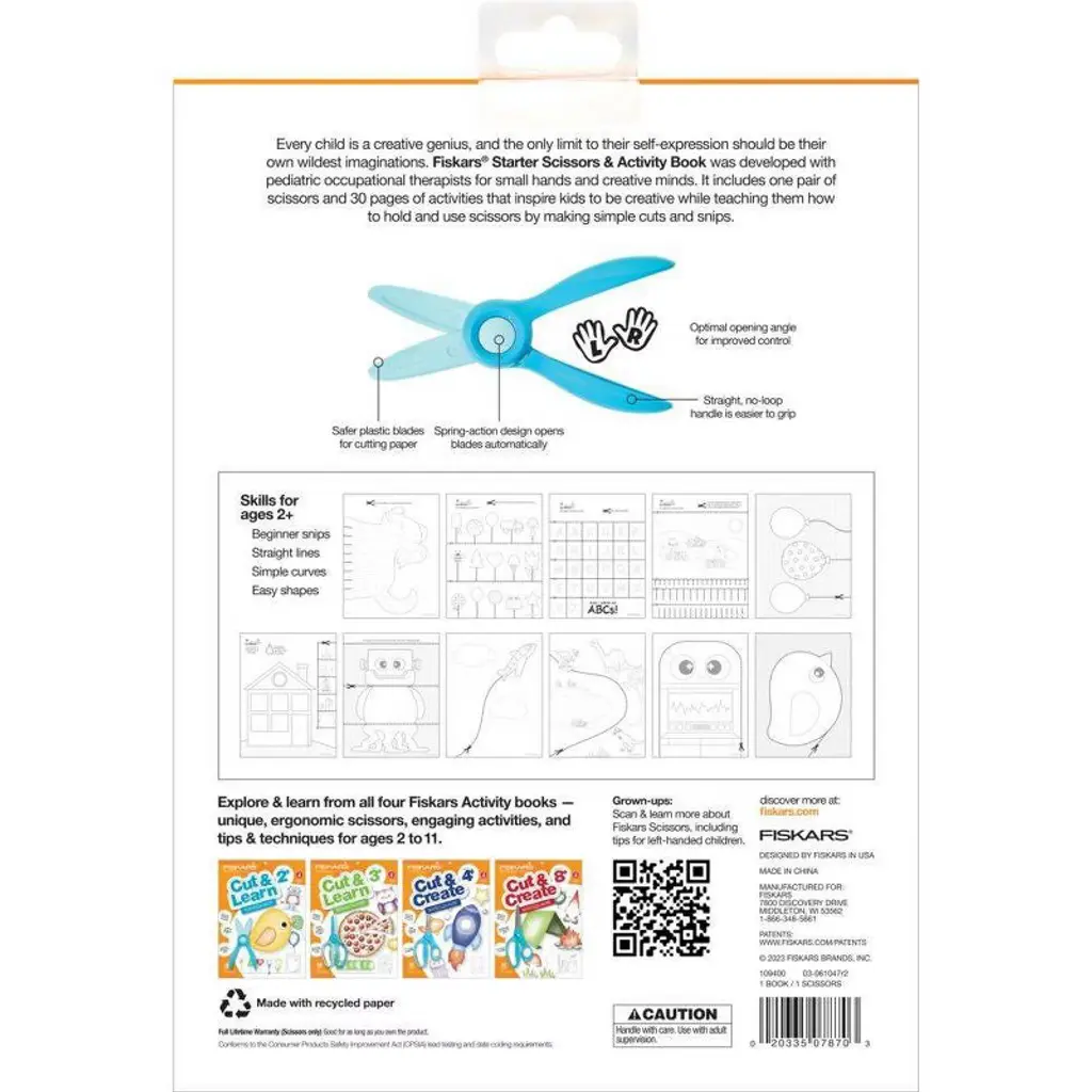 Every child is a creative genius, and the only limit to their self-expression should be their own wildest imaginations. Fiskars® Starter Scissors & Activity Book (Ages 2+) was developed with pediatric occupational therapists for small hands and creative minds. It includes one pair of age-appropriate safety scissors and 30 pages of activities that teach basic scissors skills and inspire kids to create. Fiskars Starter Scissors have plastic safety scissors blades that only cut paper. The easy-to-grip, no-loop handle has spring-action to open the blades after each cut, allowing beginners to focus solely on developing the closing motion. The activity book contains black and white pages with designs that can be colored and cut. When kids use the scissors with the activity book, they learn how to use scissors to make beginner snips and cuts on straight lines, simple curves, and easy shapes. Ideal for ages two and up and suitable for both left- and right-handed use