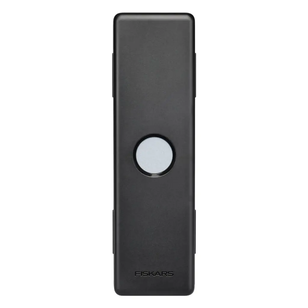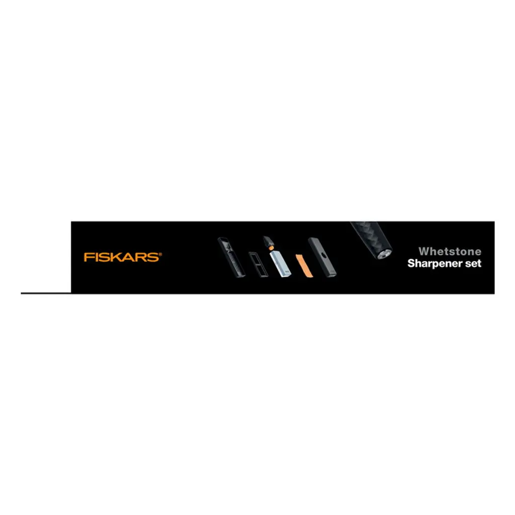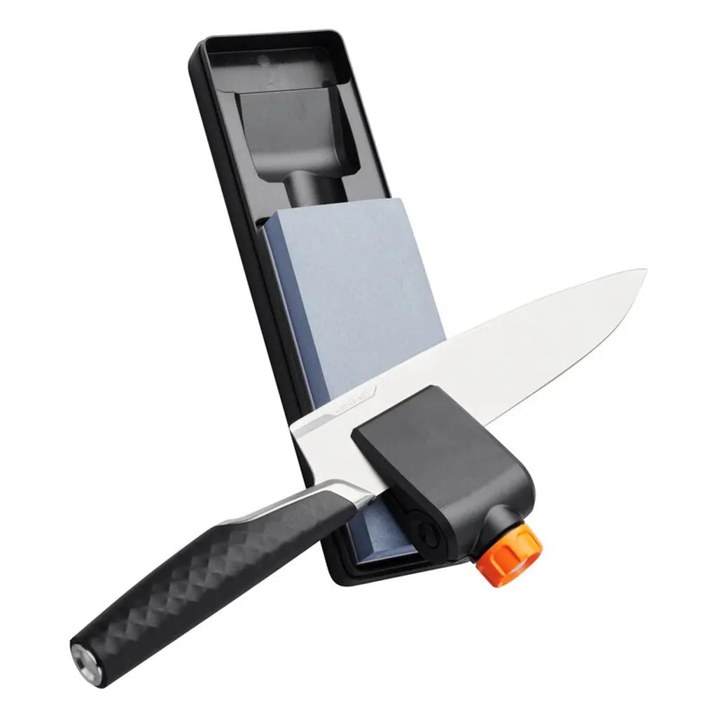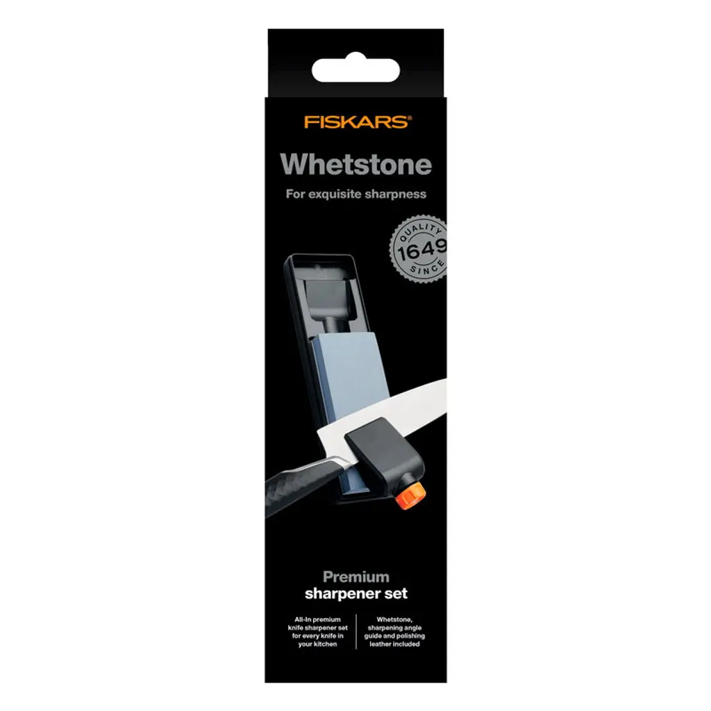 Fiskars Premium whetstone sharpener is suitable for sharpening all kitchen knives. The sharpener comes with an angle guide that makes it easier to achieve the optimal sharpening angle – for Fiskars knives it is 26 degrees. In addition to the stone block and guide, the set includes a bracket that prevents the stone from slipping, a piece of polishing leather and a case for storing the whetstone.