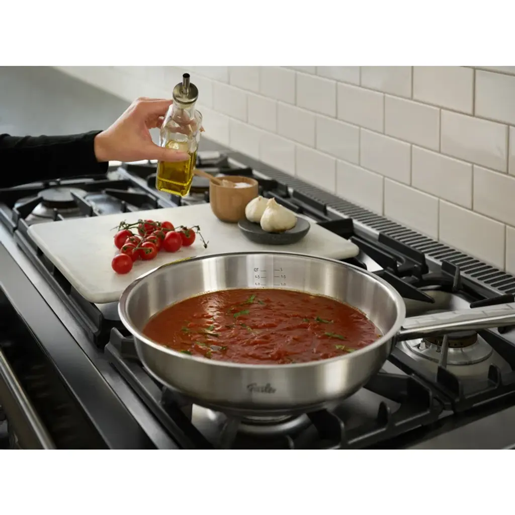 Matches the cookware line with the same name, scratch resistant inner surface, inner scale, induction-compatible cook star all-stove base, and stainless steel stay-cool handle. Oven proof.