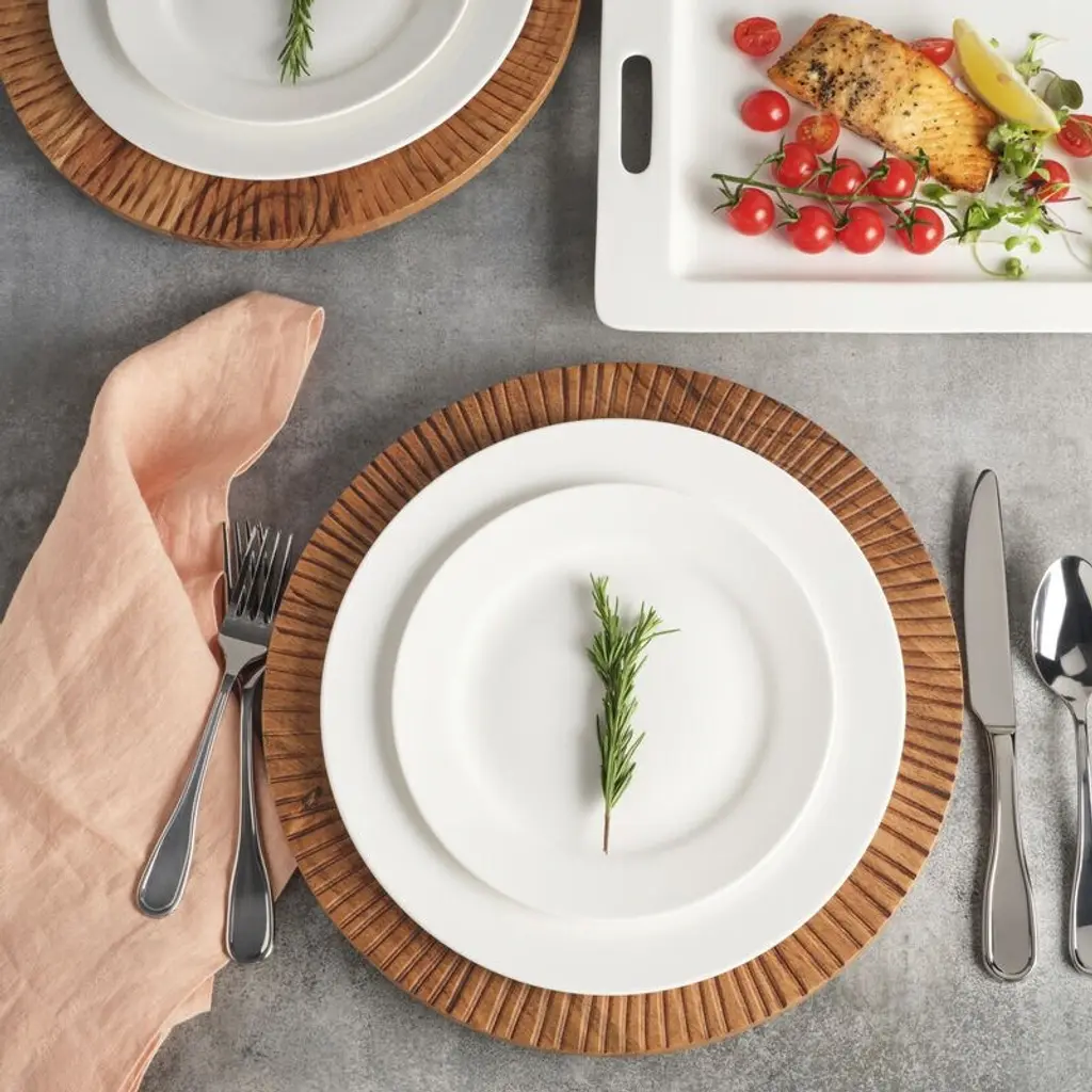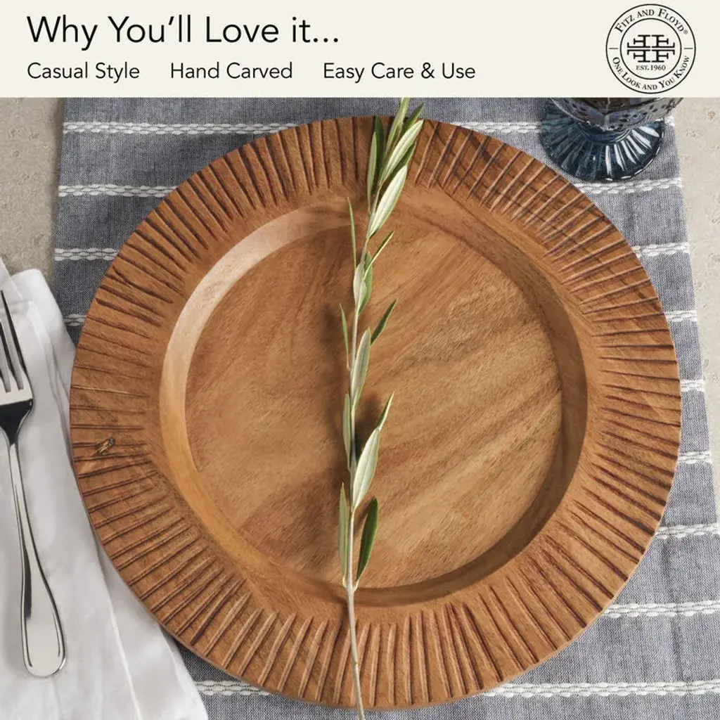 Bring a bold visual element to your tabletop with this Caleb Natural Set of 2 Chargers by Fitz and Floyd. Crafted of natural acacia wood these striking acacia wood chargers feature intentionally imperfect forms, soft curves, and primitive details, and will create a dramatic border around your favorite dinnerware. Set of 2, each measuring 12-3/4 inches in diameter by 1 inch high. Hand-wash with warm water and a mild detergent; rinse and dry immediately.STUNNING CHARGERS: these striking acacia wood chargers feature intentionally imperfect forms, soft curves, and primitive details SET A BOLD TABLETOP: these eye-catching chargers create a dramatic border around your favorite dinnerware SET OF 2: each charger measures 12-3/4 inches in diameter by 1 inch high BEAUTIFULLY MADE: crafted of natural acacia wood EASY CARE: hand-wash with warm water and a mild detergent; rinse and dry immediately