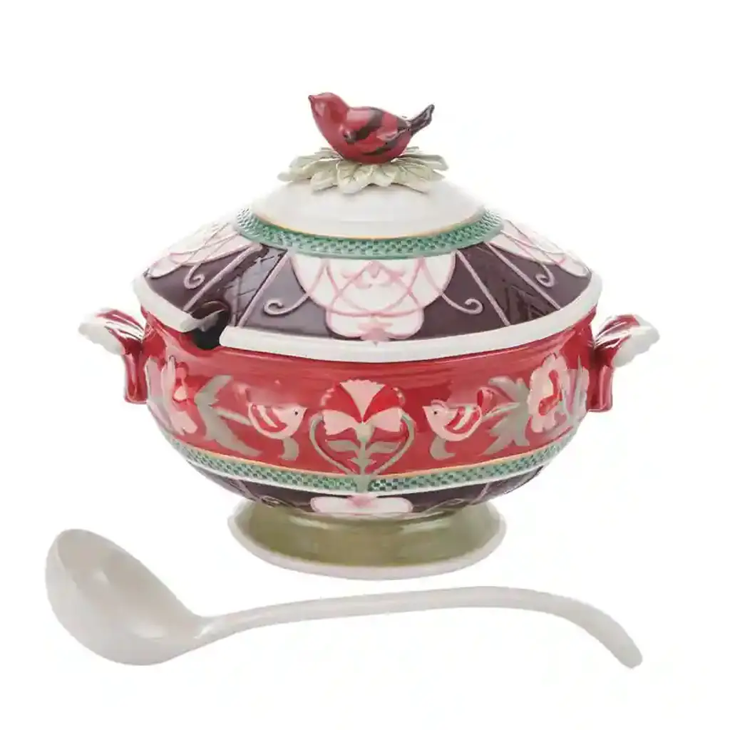 This stunning Tureen with Ladle by Fitz and Floyd brings seasonal spirit to all your gatherings. Crafted of earthenware, this elegant serving piece in a prism of red, green, pink, maroon, and white has convenient handles, a white ladle to scoop out and serve the contents to guests, and a lid with a red bird figurine accent and a notch to keep the ladle in place when not in use. Generously sized, this tureen is great or serving gravy, sauces, soups, chili, and more. Tureen measures 12-1/2 inches length by 10-inches width by 9-1/2 inches height and a 3 quart capacity; Ladle measures 11-1/2 inches length x 3-1/4 inches wide. Hand-washing recommended to prolong the life of the product.