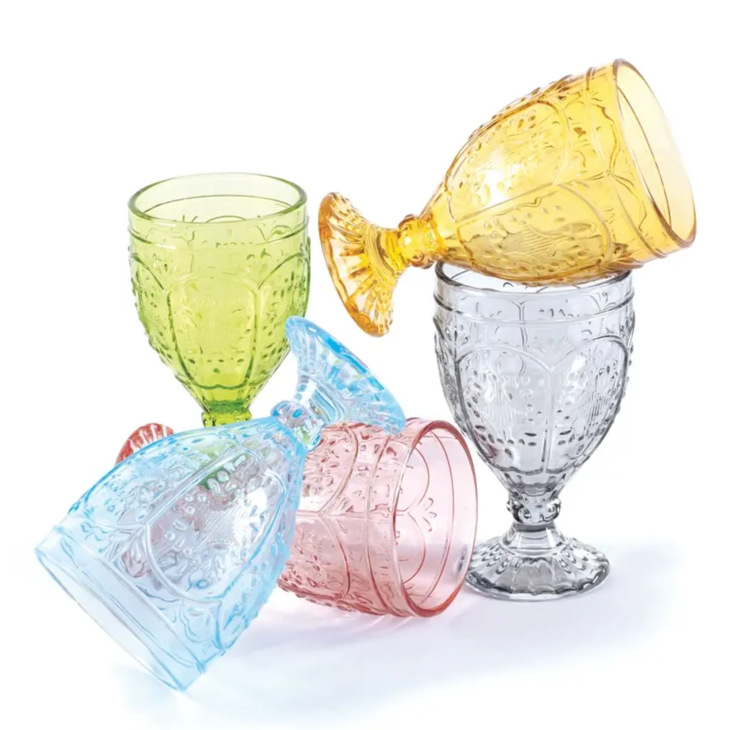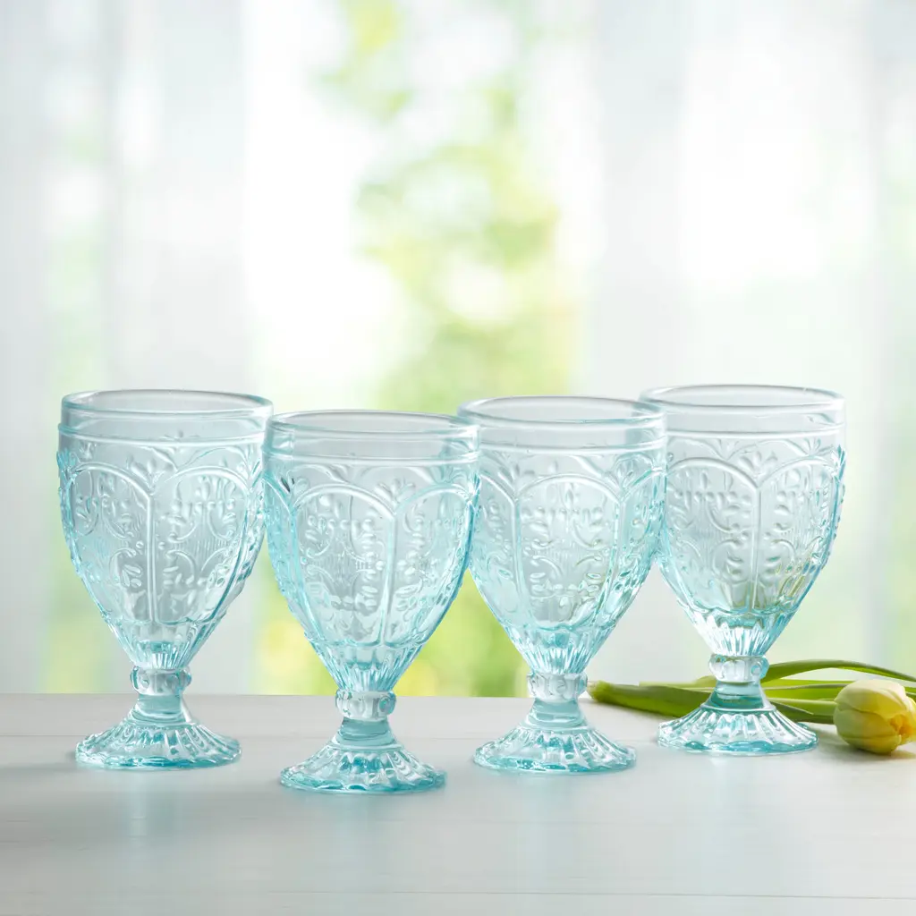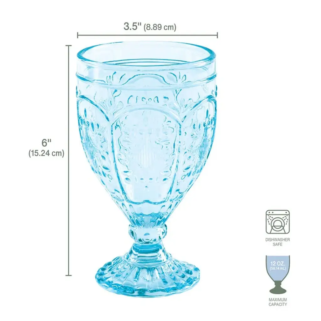 Add a touch of style to your table with this Set of 4 Trestle Aqua Goblets. Each piece is artistically designed with vintage style that transcends beautifully from classic to contemporary table settings. Pressed and molded for crisp distinct detail, the clarity and quality of our Trestle glassware will be enjoyed for years to come. Set includes 4 aqua goblets each measuring 6-inches Height x 3.5-inches Diameter and 12 ounce capacity. Dishwasher safe for quick cleanup. One Look and You'll Know its Fitz and Floyd!