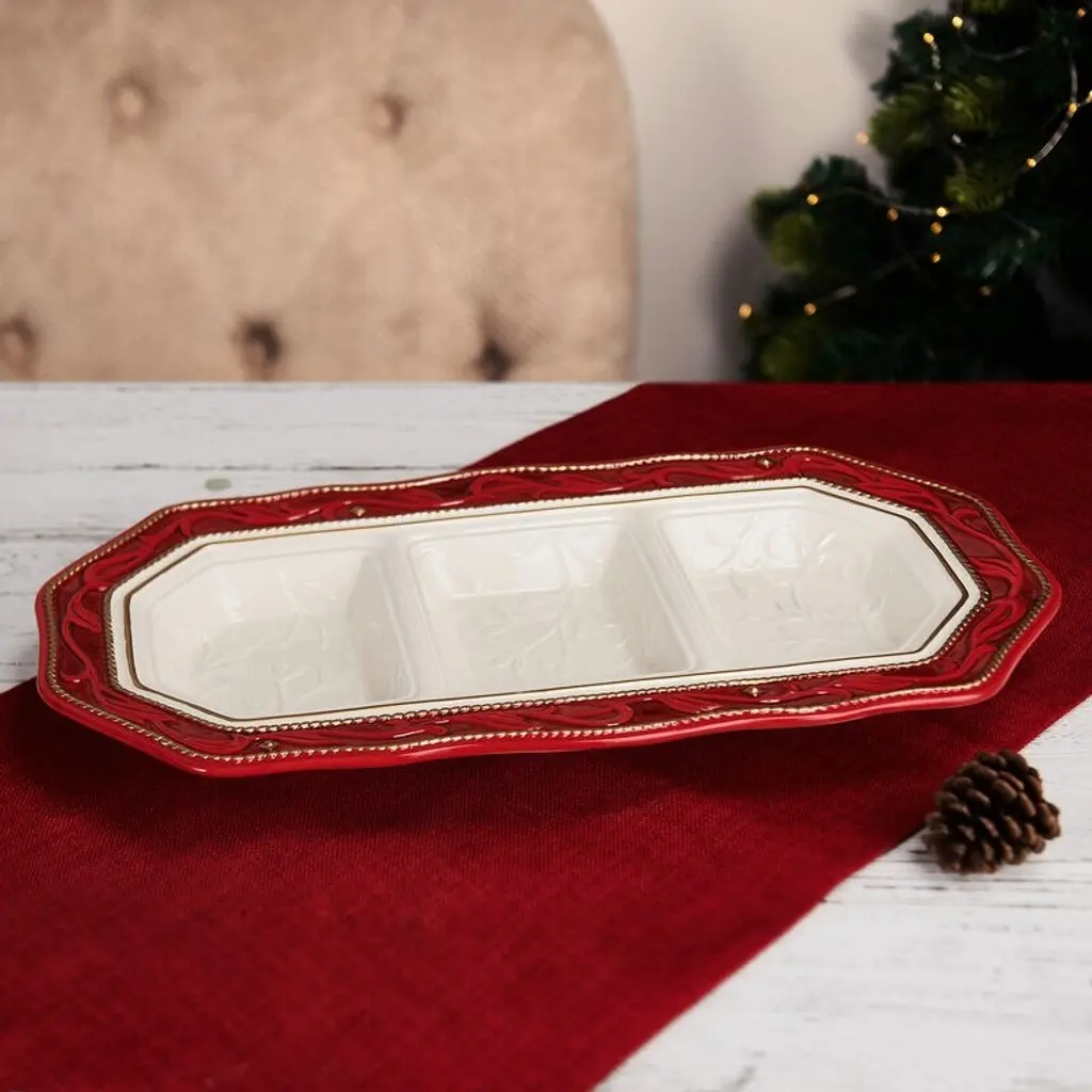 Bring a festive, celebratory feel to all your holiday gatherings with this Telluride Sectional Server by Fitz and Floyd. Crafted of ceramic earthenware, this elegant server in vibrant red with a white center and gold accents features a raised garland design around the rim and embossed branch details in the center. Generously sized, this server has three sections to present a variety of foods like candies, nuts, veggies and dip, and much more to guests. Measures 17 inches long by 9 inches wide by 1-1/4 inches high ; each section has a 6-ounce capacity. Hand-washing recommended to extend the life of the product.
