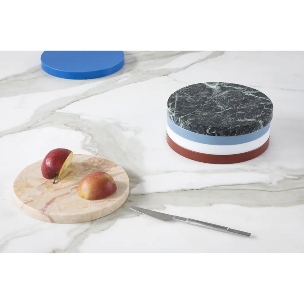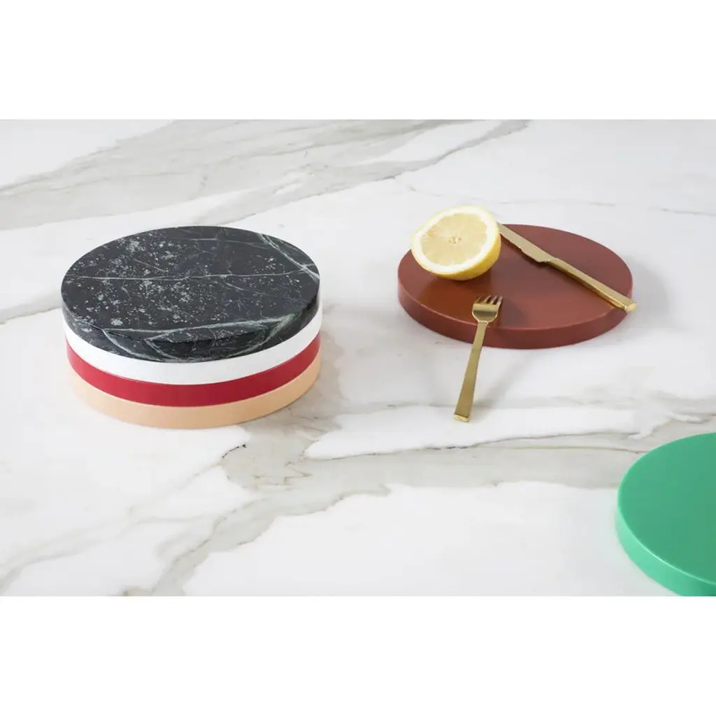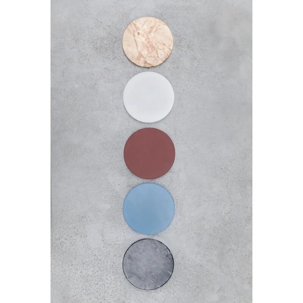 Five Circles by valerie objects are both functional everyday objects and sophisticated geometric decorative pieces. Designed by Muller Van Severen, the Five Circles set is a perfect example of the design studio's ideology, which encourages keeping objects as part of the décor rather than hiding them out of view after use. The round trays bring color and joy to table settings, but can also be used to hold small treasures in the other rooms of the home. Try creating a charming tower of five circles that can then be dismantled piece by piece: every time you need a plate or tray, just grab a new circle from the stack! Set C contains five pieces: a white, burgundy and light blue plastic circle and one dark and one light marble tray.